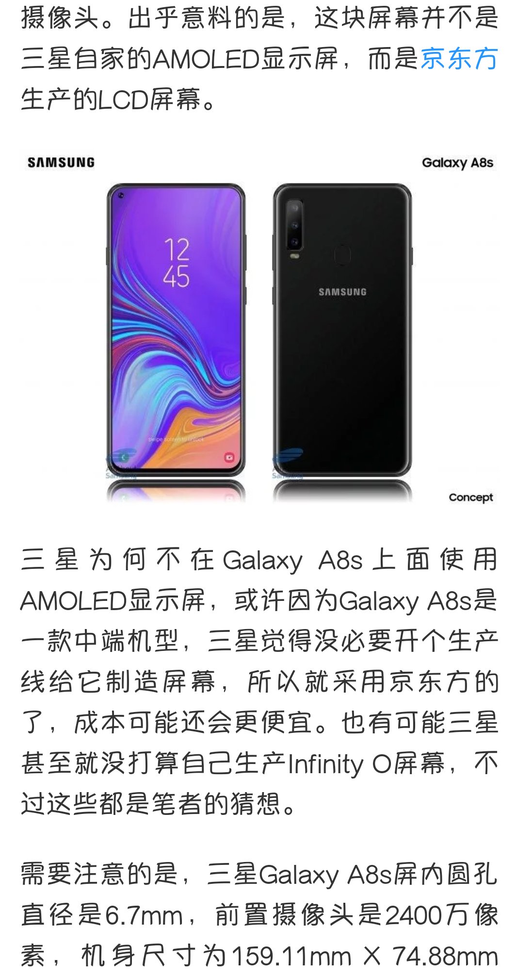 这次已经确定会是京东方的挖孔屏了,据说是三星为了降低成本以实现更低售价下的市场占领。