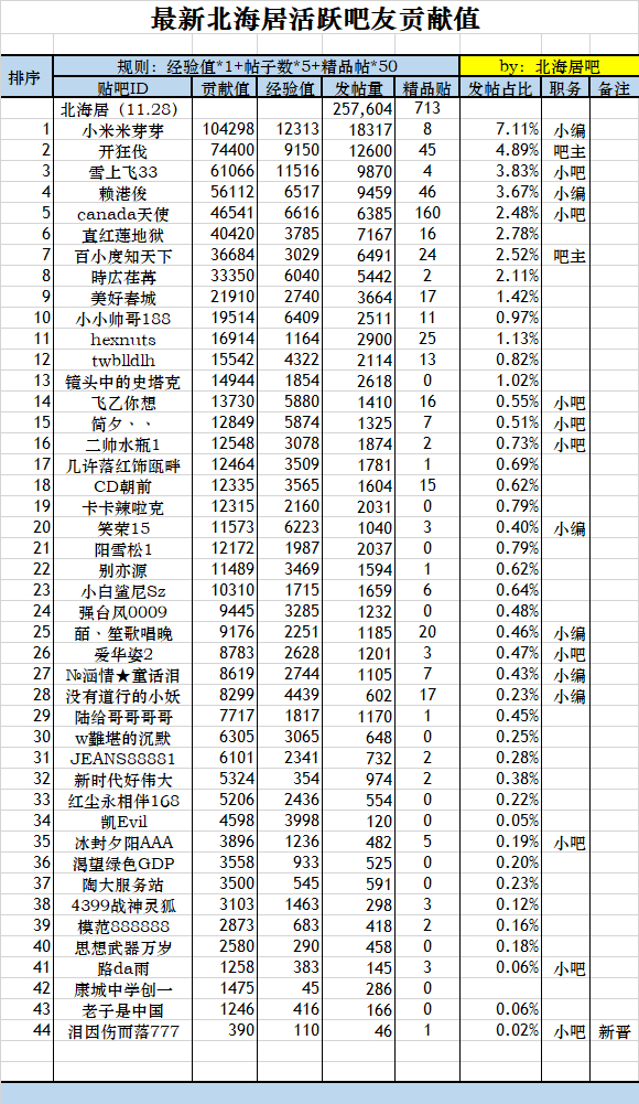 【北海居】最新北海居吧友活跃贡献值排名(11.28)