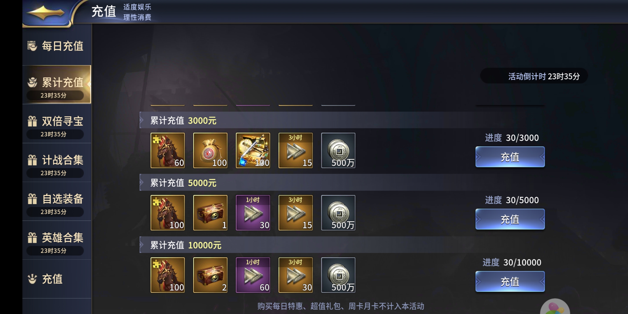累积这一块,先不说多少钱,要么直接130英雄,要么130宝物,不要搞一些乱七八糟的120啥的进去,其他更离谱。
