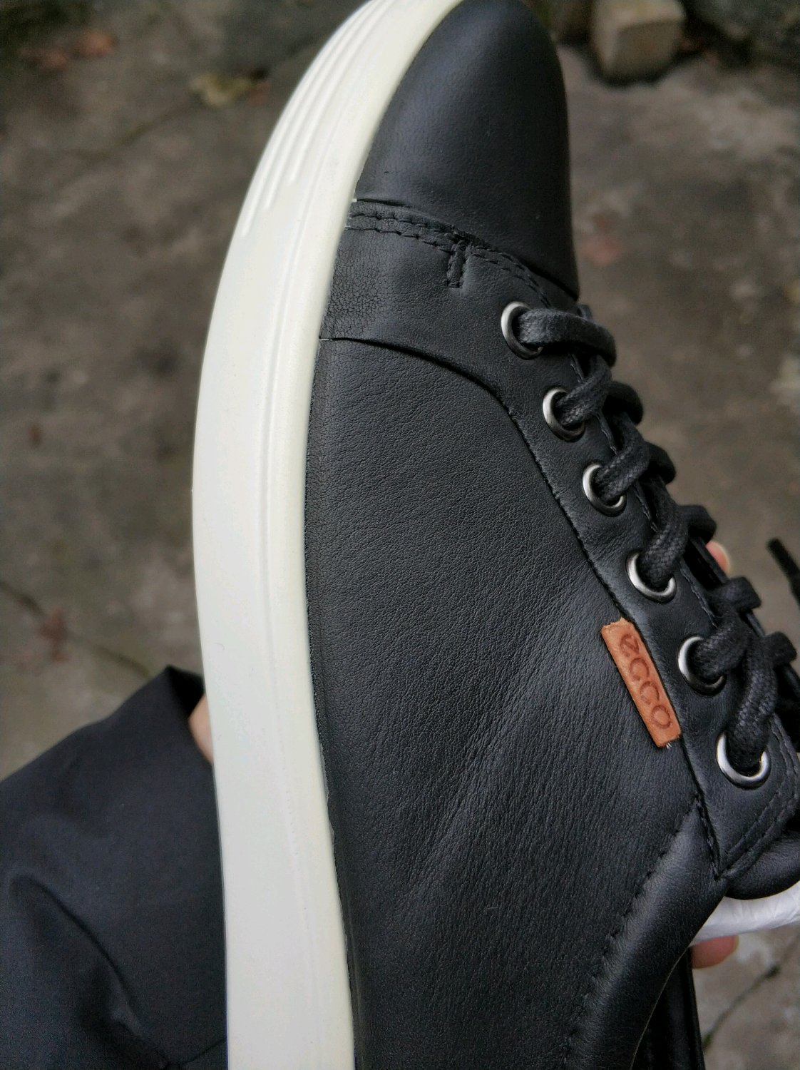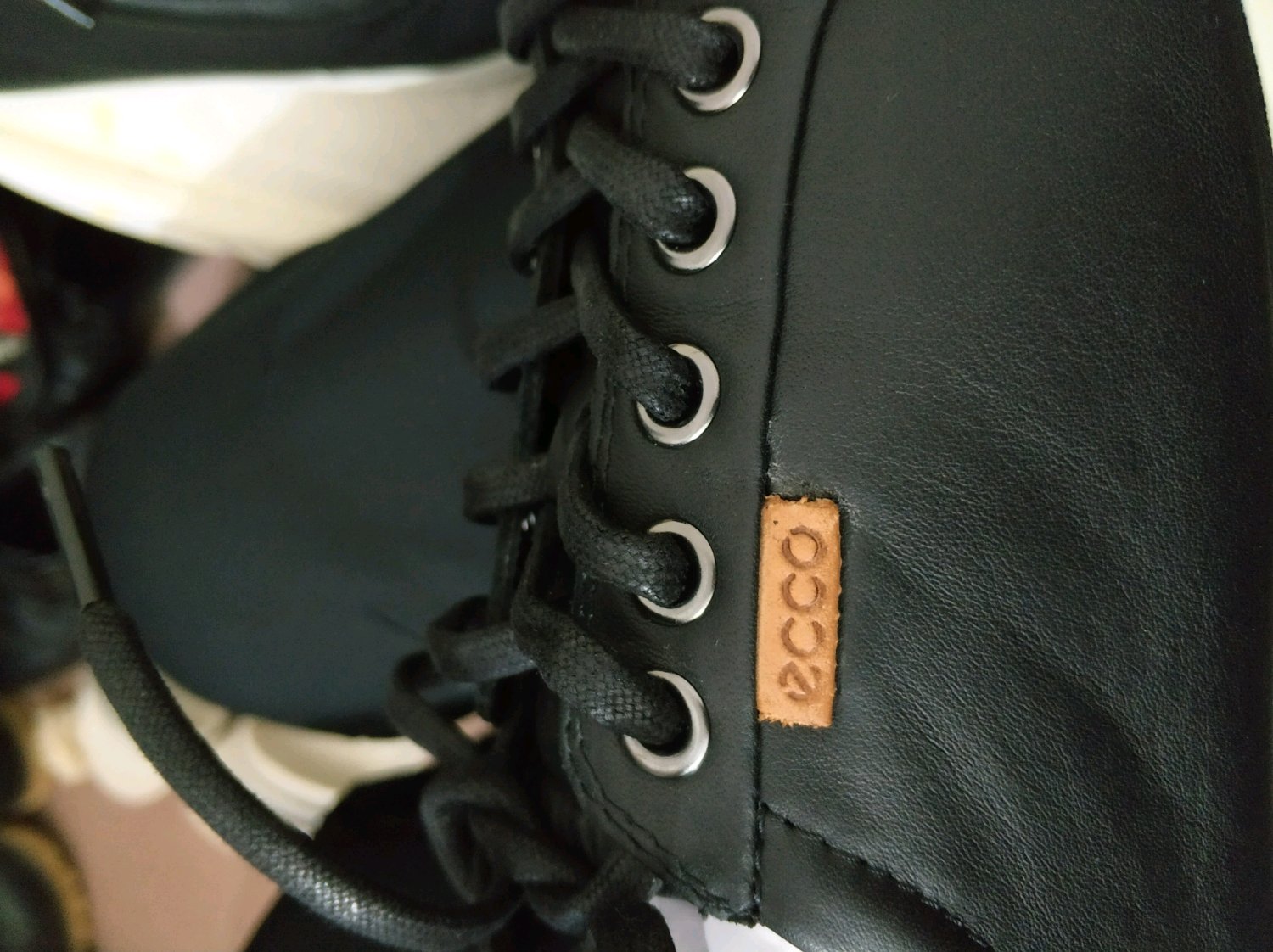 鞋带是我自己系的,ecco那个标志是用胶粘住的吗,第一次买乐步的鞋,标志那里有点溢胶了