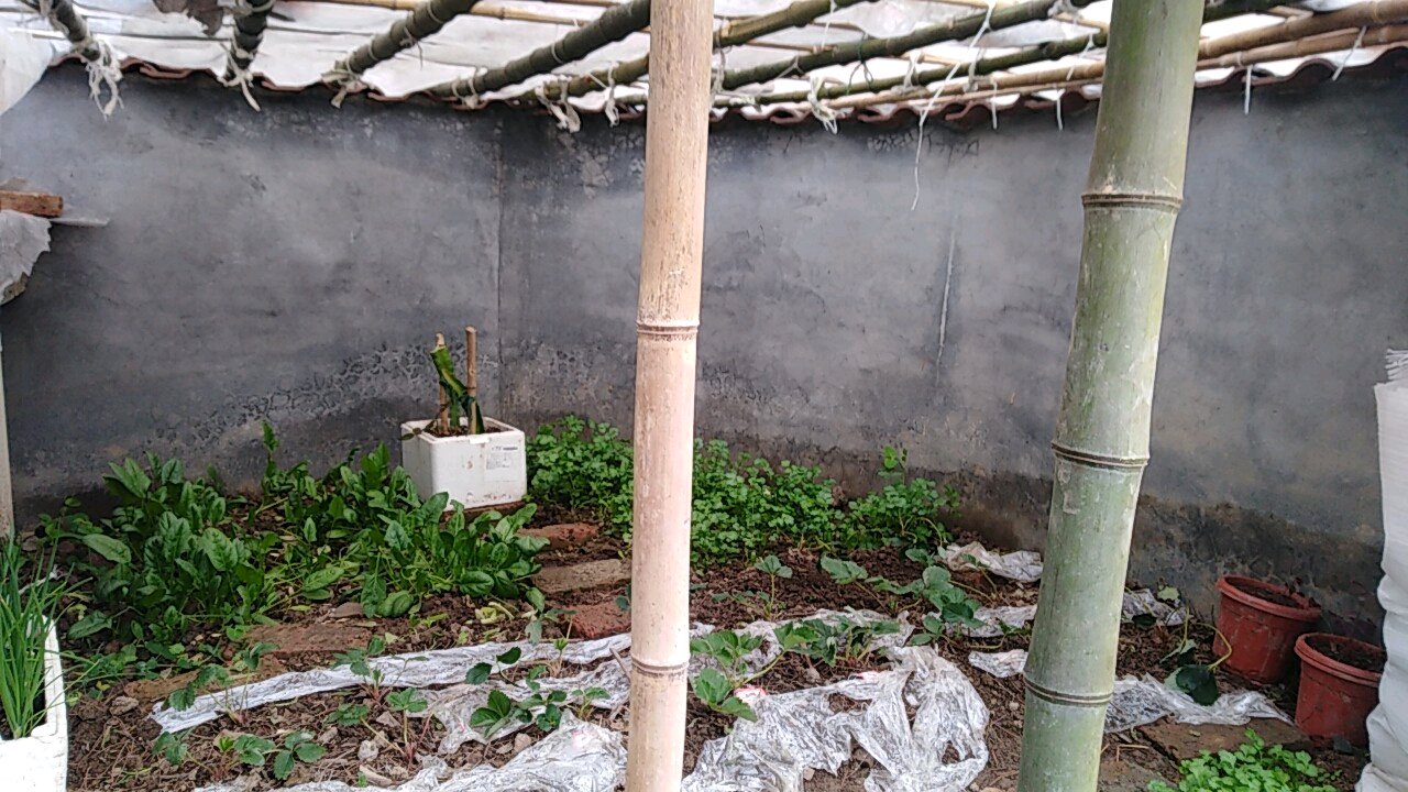 我已经搭了暖棚。天太冷的话,我就把挂着的塑料布放下来。