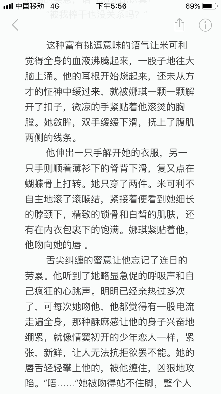 当然,他也没有机会再想下去,因为娜琪细密的吻落在了他的唇上。米可利收紧了手臂,擒住她的下唇开始攻城略地。