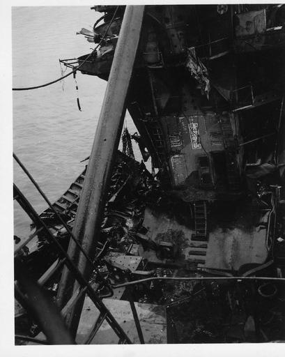 战舰伊势的残骸,图中斜着的粗大钢管是吊艇杆