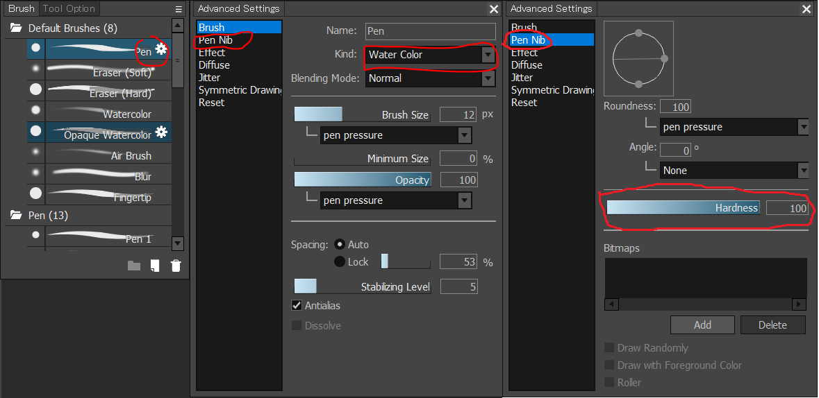 在笔刷的详细设置里,笔类型【不要选钢笔pen】,接下来就可以调节硬度hardness了。