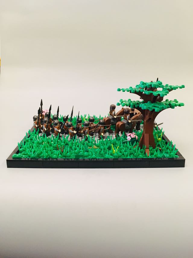 一层是四个20✖️16的黑底板、第二层全用的人仔底板铺上,第三层用的N个8✖️6和6✖️4的绿色或米色板铺上,第四层放草和石头等,地台边用的1✖️8和1✖️6的黑色高砖,最后用黑色光面砖。