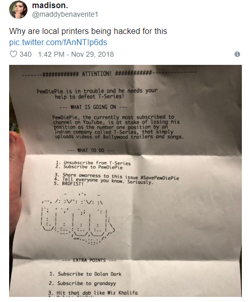 油管第一主播地位遭遇印度音乐团体T-series威胁。随后出现不明黑客黑入打印机打印宣传信号召当地居民关注pewdiepie。
