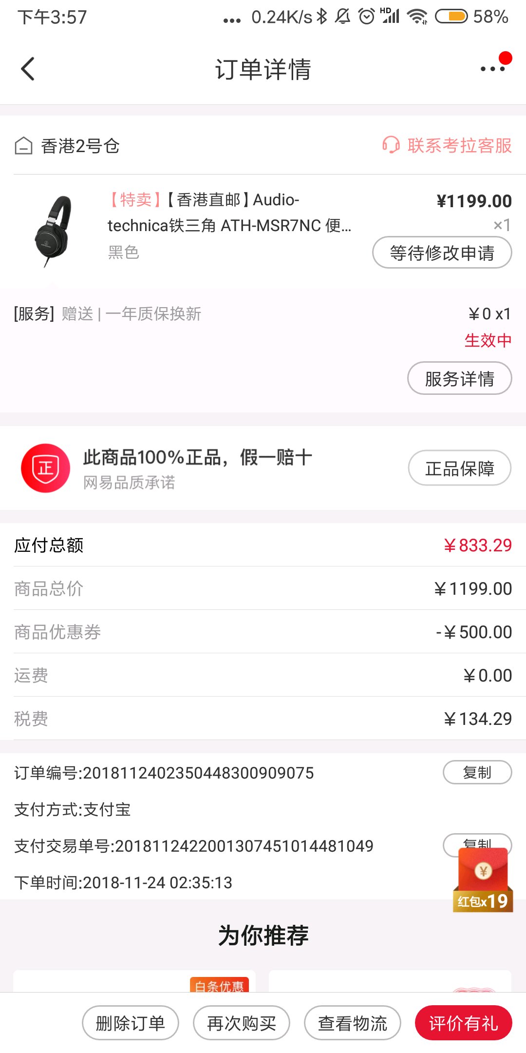当时控制不住自己的双手下了单,买来后想想之前原价买的1000xm还没嗝屁,就不留这货吃灰了。因为没有塑封,开箱验过货,网易也不给退海外购的东西,有一年网易质保换新服务。