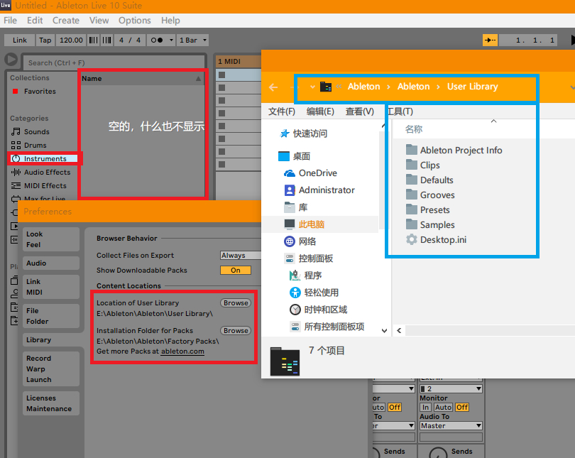 Ableton Live出问题了,如下图,浏览器里面什么都不显示,请教大家怎么办?、谢了!!!
