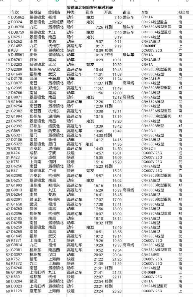 景德镇北站列车时刻表 自2019.01.05起实行