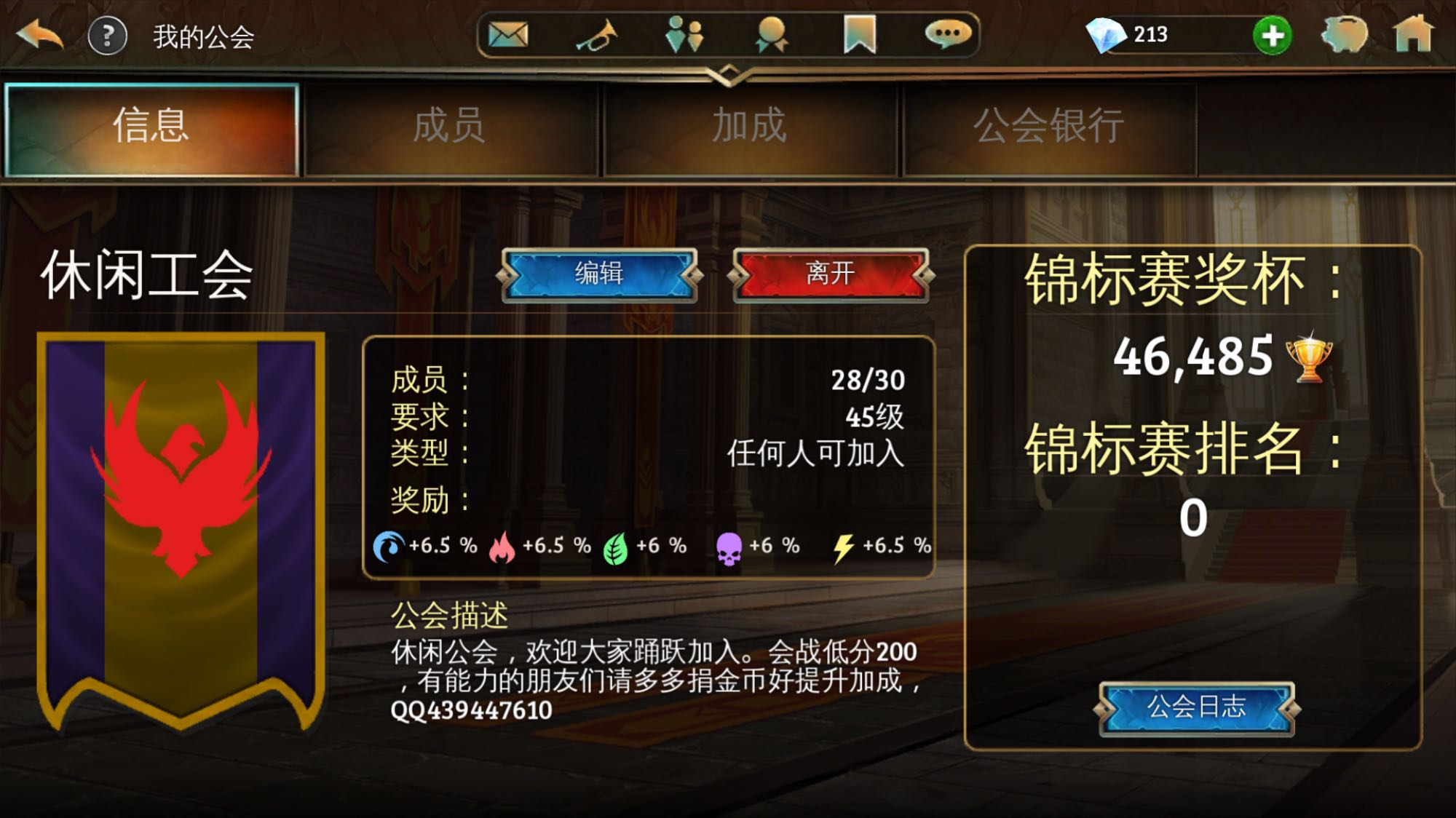 休闲工会招收活跃玩家目前还有两个位置。欢迎朋友们直接加入。
