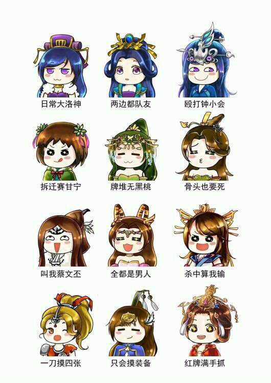 甄姬、郭皇后、辛宪英;孙鲁育、步练师、徐氏;蔡文姬、貂蝉、曹节;马云騄、诸葛果、吴苋。