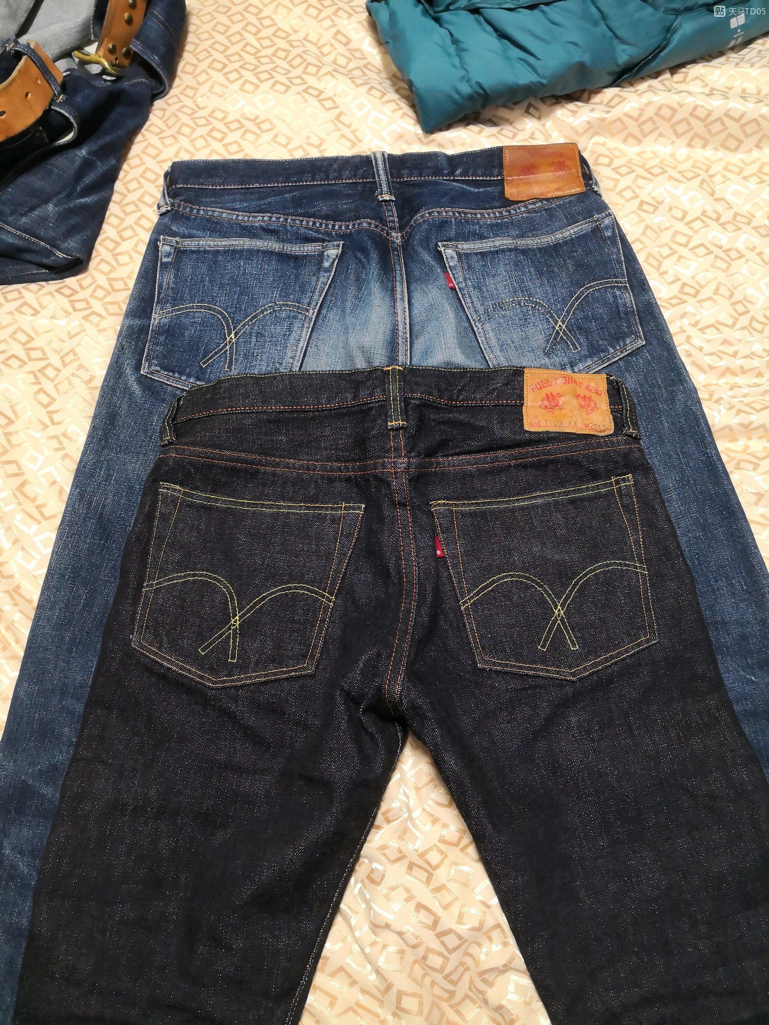 1108是大学时穿的了 比较久远的一条老版裤 1109xx是这几天才入的 还没开养 不得不说津巴布韦棉很舒服 越穿越软 腰围也会越撑越大 1108是33码的 这几年瘦了好多 1109xx直接入了29的 也不卡蛋 很修 15.5的磅数也比1108来的更有感觉 还有五金的对比 感觉老版的1108细节要强于现款 旧化之后很有味道 总之两条都是好裤子 1108直筒 1109xx修身 配不同的靴子有不同风格 期待1109xx落色 哈哈