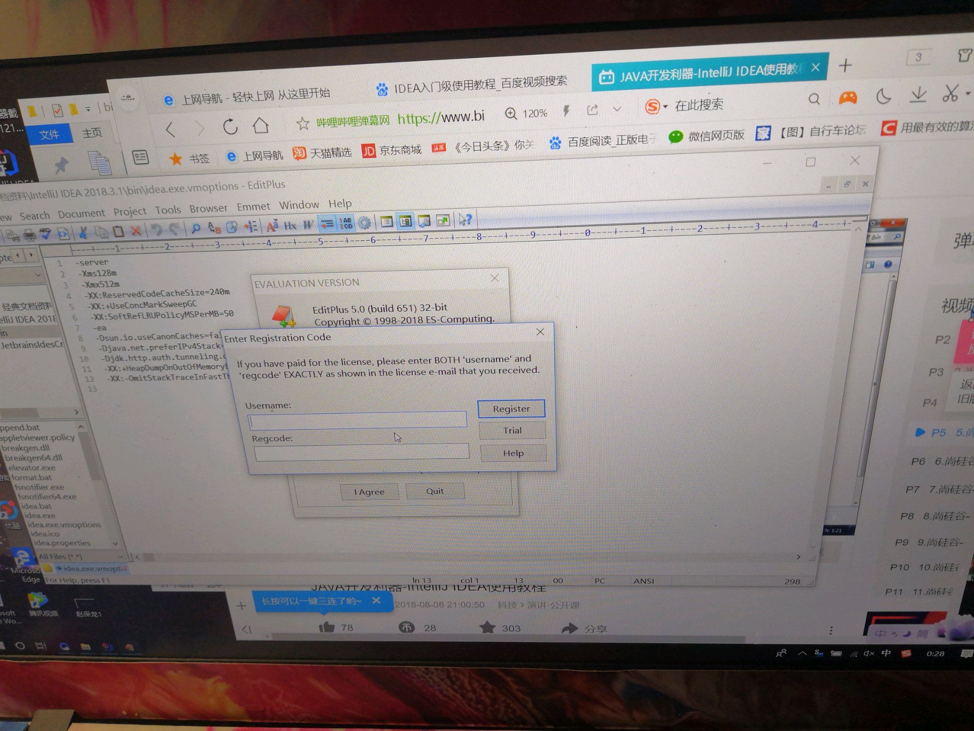 去这里(http://idea.lanyus.com/)下载这个 JetbrainsIdesCrack-3.4-release-enc.jar ,放在idea的bin文件夹下,然后再idea的bin目录找到idea64.exe.vmoptions和idea.exe.vmoptions文件用编辑器打开在最后面加-javaagent:D:\Program Files\ideaIU-2017.3.3.win\bin\JetbrainsCrack-2.10-release-enc.jar ,注意路径是你那边的路径哈