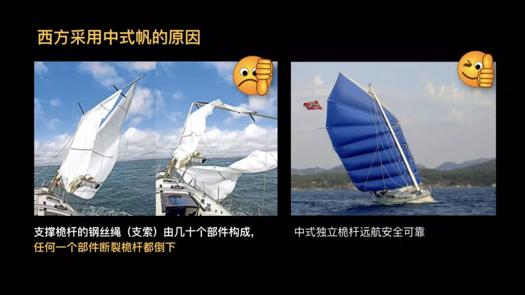 比如说方顶帆,四十年前的西方帆船是三角帆的,最近十年,他们才改成了方顶。因为他们发现上层的风是最好的风,越靠近水面的风,风力越低。而我们中式帆船很早就把上层的风用起来了。然后是全帆骨,西方的帆船从前就是一大块布,最近这十几年才开始在里头增加帆骨。而我们中式帆,自古以来都是全帆骨的。