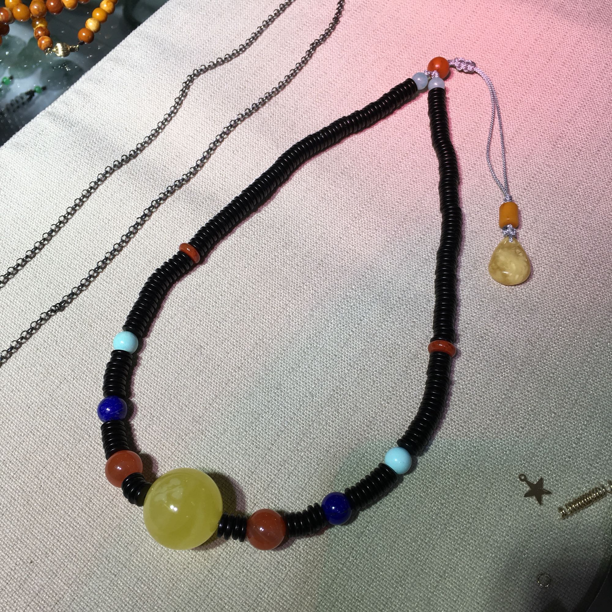 快过年了,赶紧把家里的珠子拿出来晒晒,刚穿好一条,自留不出。