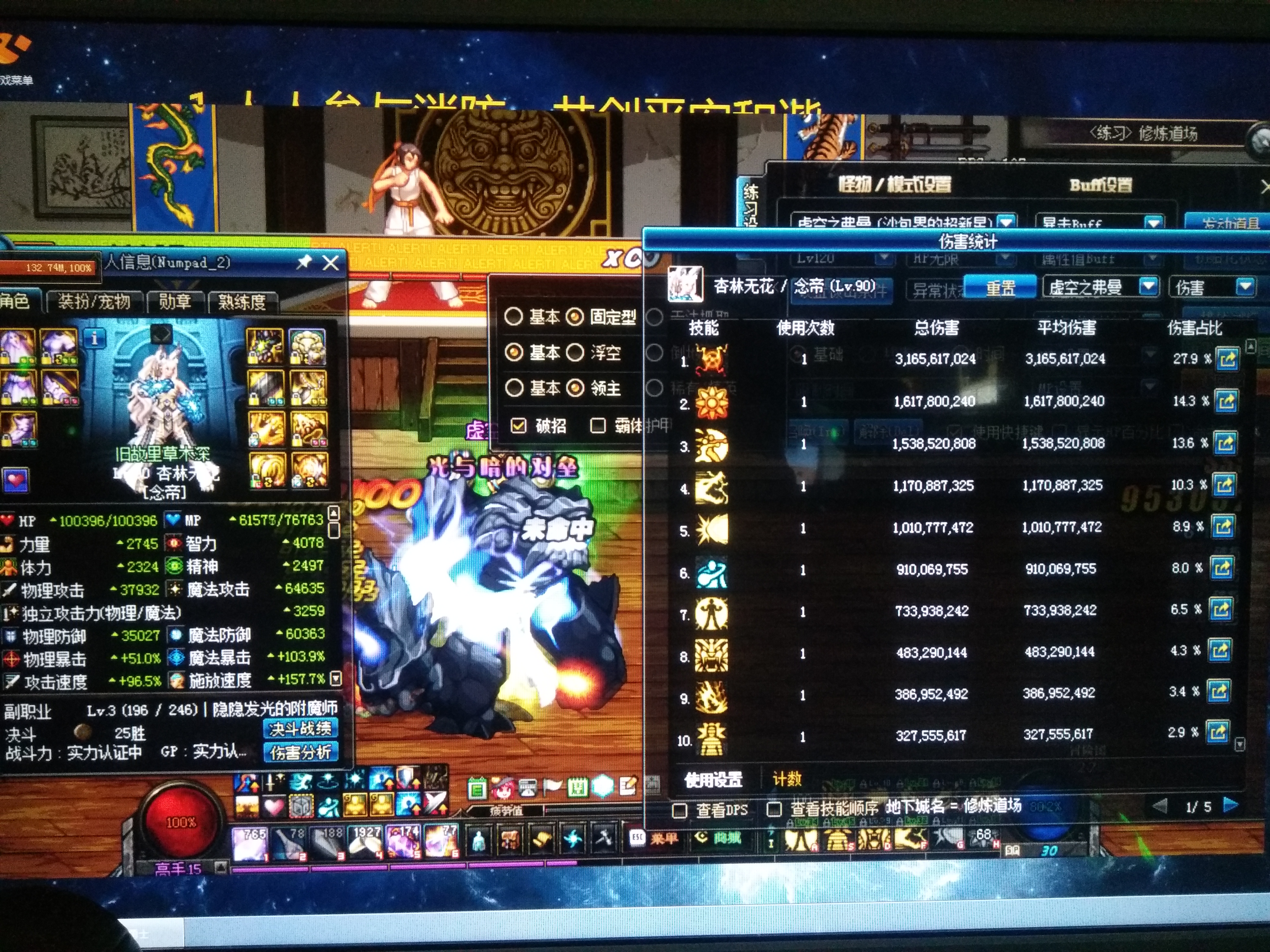 刚刚打完超时空,把三件套做好了。现在带的是+12的守护,修炼场海伯伦光状态下16亿。。。垃圾蛇皮打造