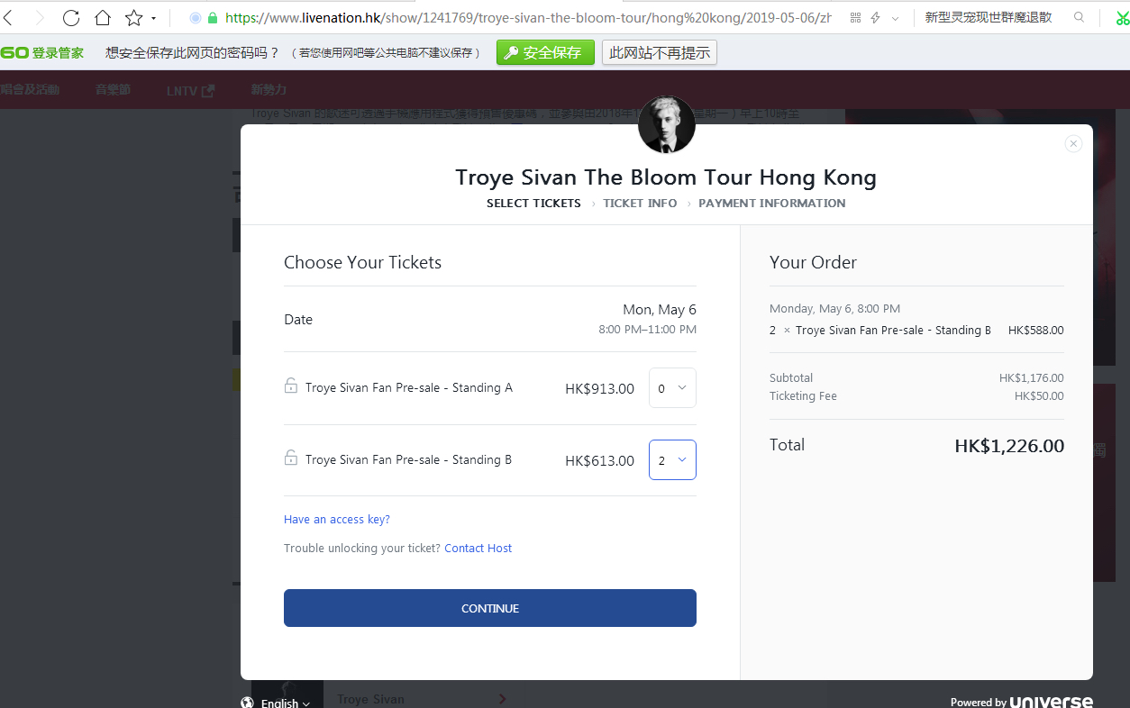 然后我还注册了livenation hk的会员,并且订阅了这场演唱会的通知,这是为了防止17号没抢到预售,可以抢19号的。lnhk这个是一定要注册的