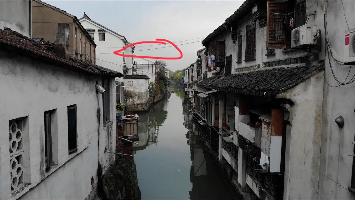 在古镇狭窄的河道上航拍,想穿过有两根网线一样的电线拍摄 。飞到电线附近想想还是升高飞过去算了,没想到卡住了……还好开了三脚架模式慢慢下打杆退了出来……不然就提控回家了……