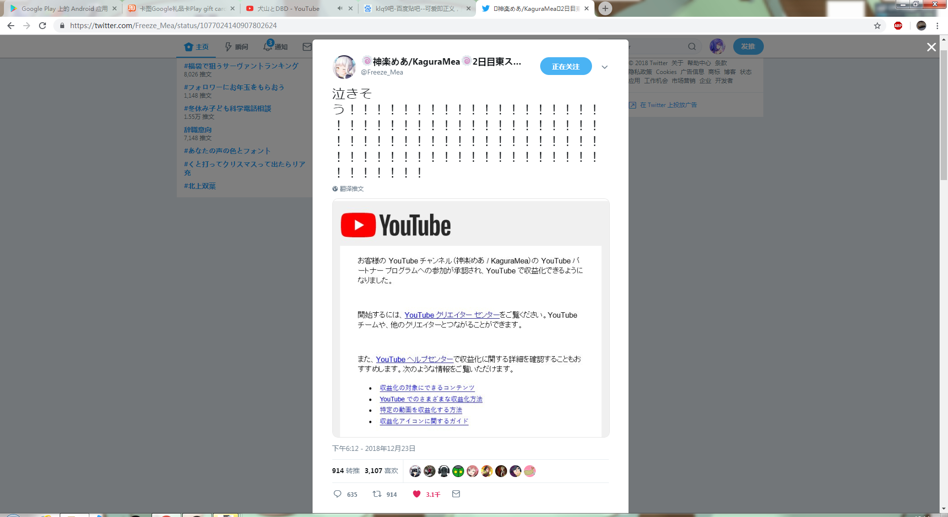 恩,现在她油管直播能直接氪金了,油管提成只有30%,昨天她开播两小时天狗氪了95w日元