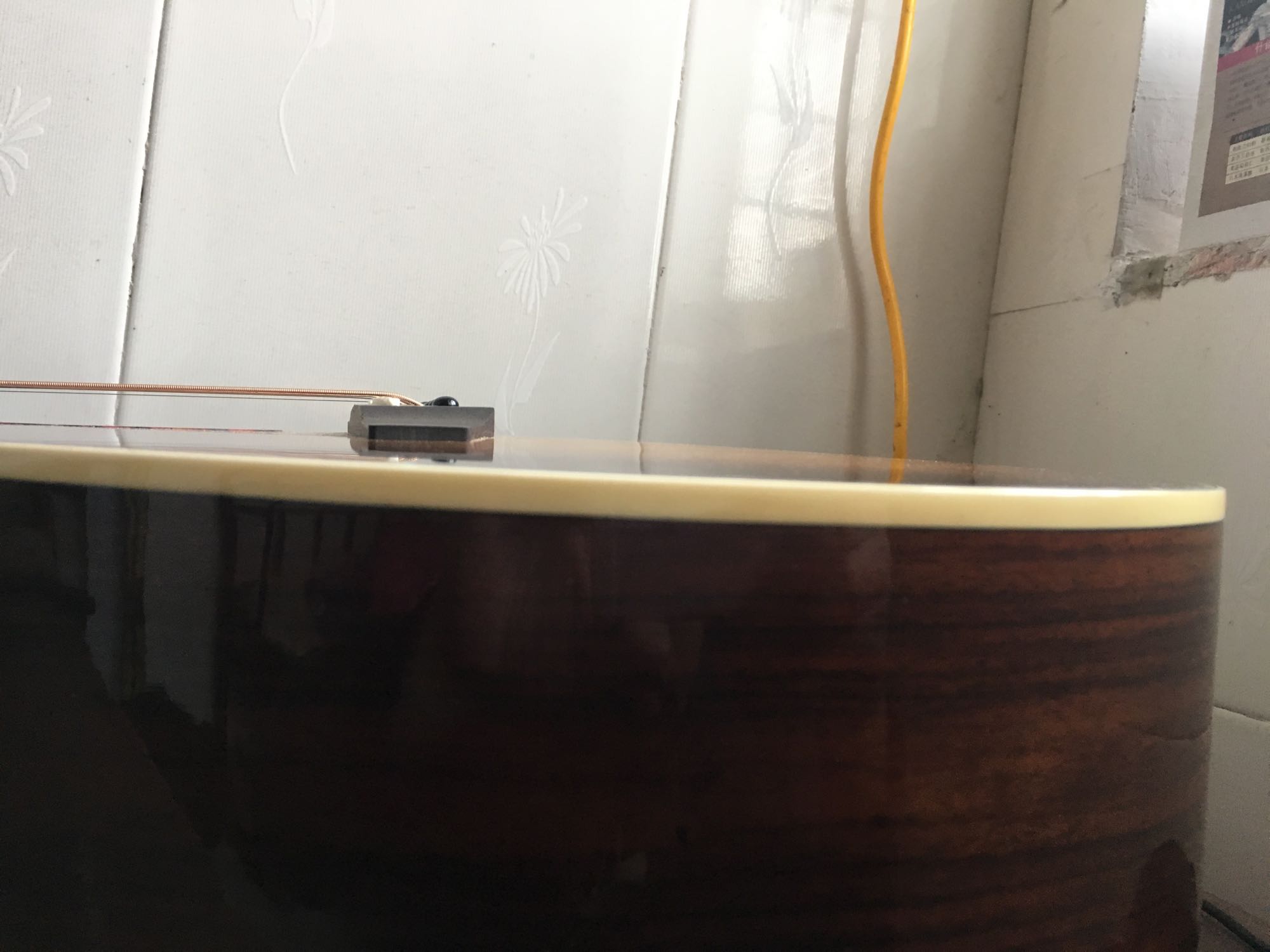 圣马克CL170面板鼓了,这两天琴一直靠着窗边放着,今天拿起来弹,发现面板有点鼓,琴码有点要开裂的迹象,吓💩了,马上松琴弦,放太阳下晒晒