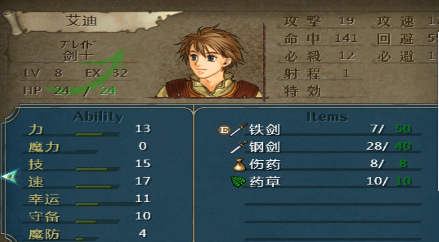 序章艾迪卸掉武器顶在前面,美女愈合手回血吃草药伤药回复,弓手带来的守备➕2给艾迪吃,第一级一定要凹守备(我用真机也只能凹这一次了),敌兵每刀最多砍3点血,如果运气好再升一点守备每刀只伤2点血,外加很多回避得1点经验,敌兵基本是武器磨光才消灭,弓手除了打掉那个带草药的基本酱油,吃光所有药品大约300轮再通序章,美女大概能到12级,艾迪6、7级,下一章的诺依斯貌似是自动对应全队最高级别,如此直接就有两个肉级输出,一直到很后来都不怕两线作战了,撒扎登场时也极肉,但是他主要工作是偷盗,靠他堵口太耽误收成啦。
