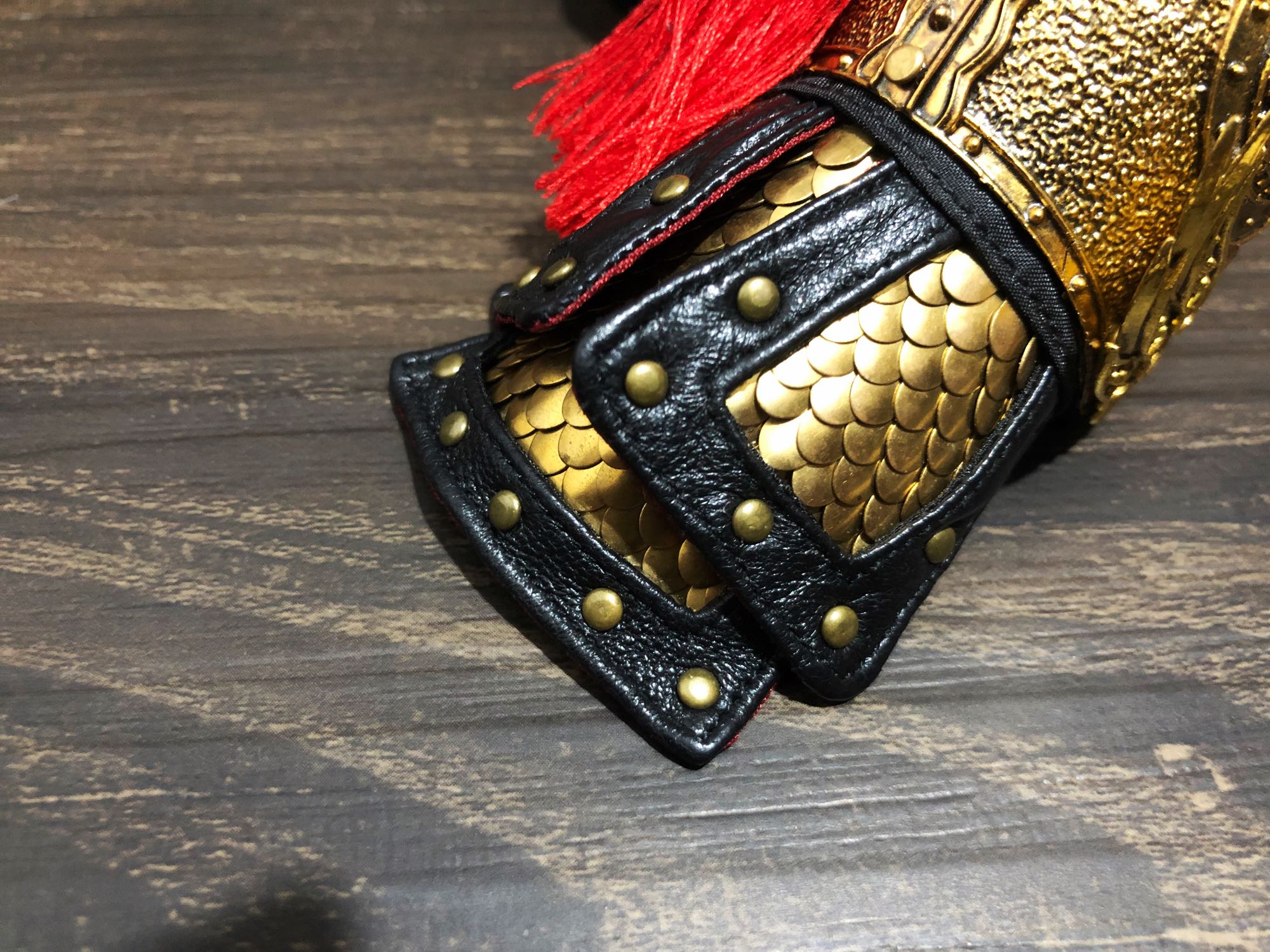 实实在在的目前量产手工金属甲的顶级作品,神将造型,可以请回家镇宅的。铠甲是我国历史上大名鼎鼎的明光铠,据说设计方面参考了连环画,整个效果非常的不凡。制作上,用料堪称奢侈,全部真小羊皮加上抗氧化铜片手工穿线,这个铜片用了两种,数量达到惊人的2000多片。。皮革和布料的缝合走线工整,最牛的是,皮革边缘几乎都做了包边。。唯一的问题,头雕稍大了一些,头身比不够完美,但也基本上正常。总体而言是今年收的所有古代题材里面最为震撼的一个。。