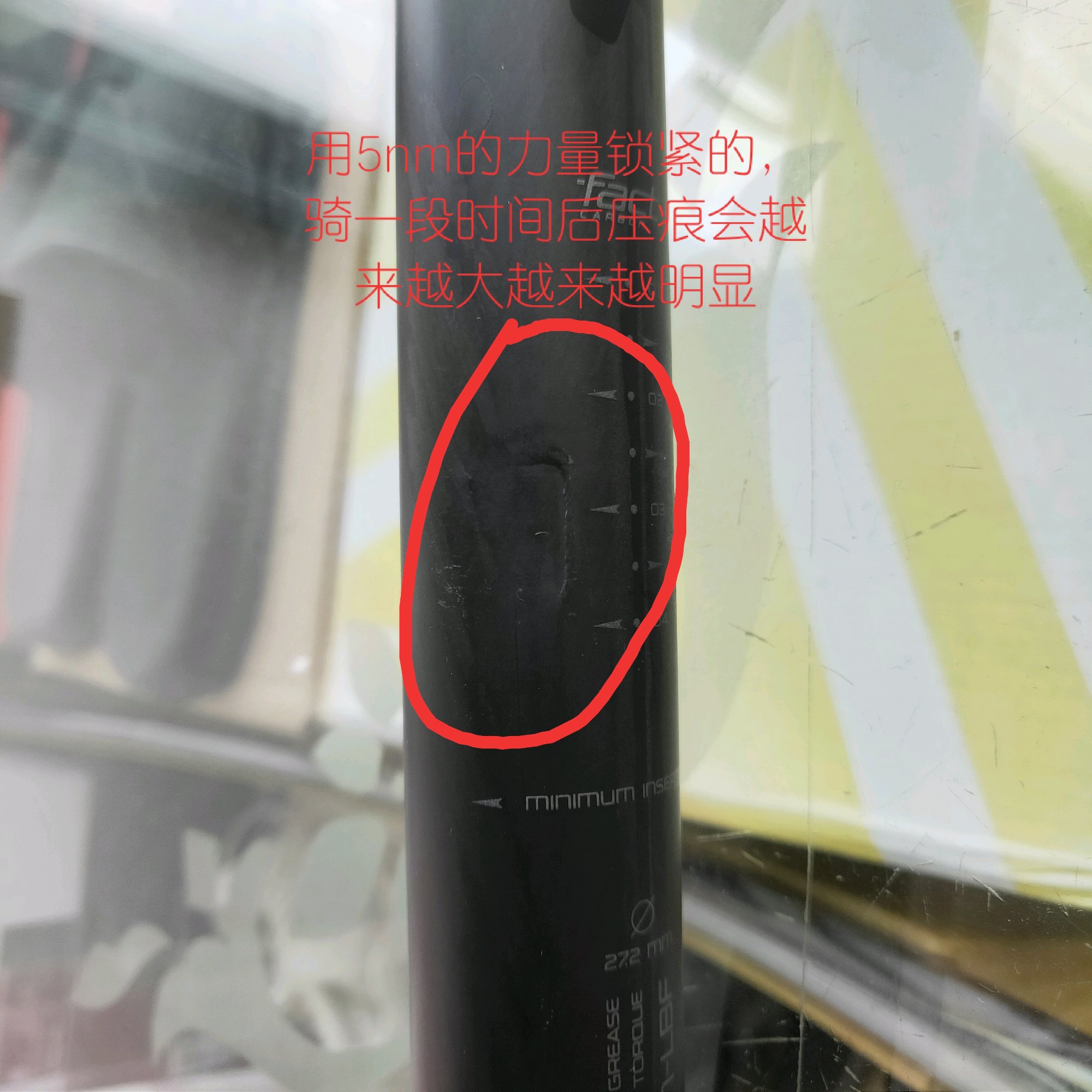 车架是闪电tarmac comp sagan 9r的,骑了一段时间坐杆有异响,之后发现这个问题,而且车店内新车该部位也有同样的压痕,就是坐杆夹造成的,不插入坐杆,然后只要扭紧两三牙螺纹,肉眼可见明显形变,这个是正常的吗??买了这个车的有发现这个问题吗?