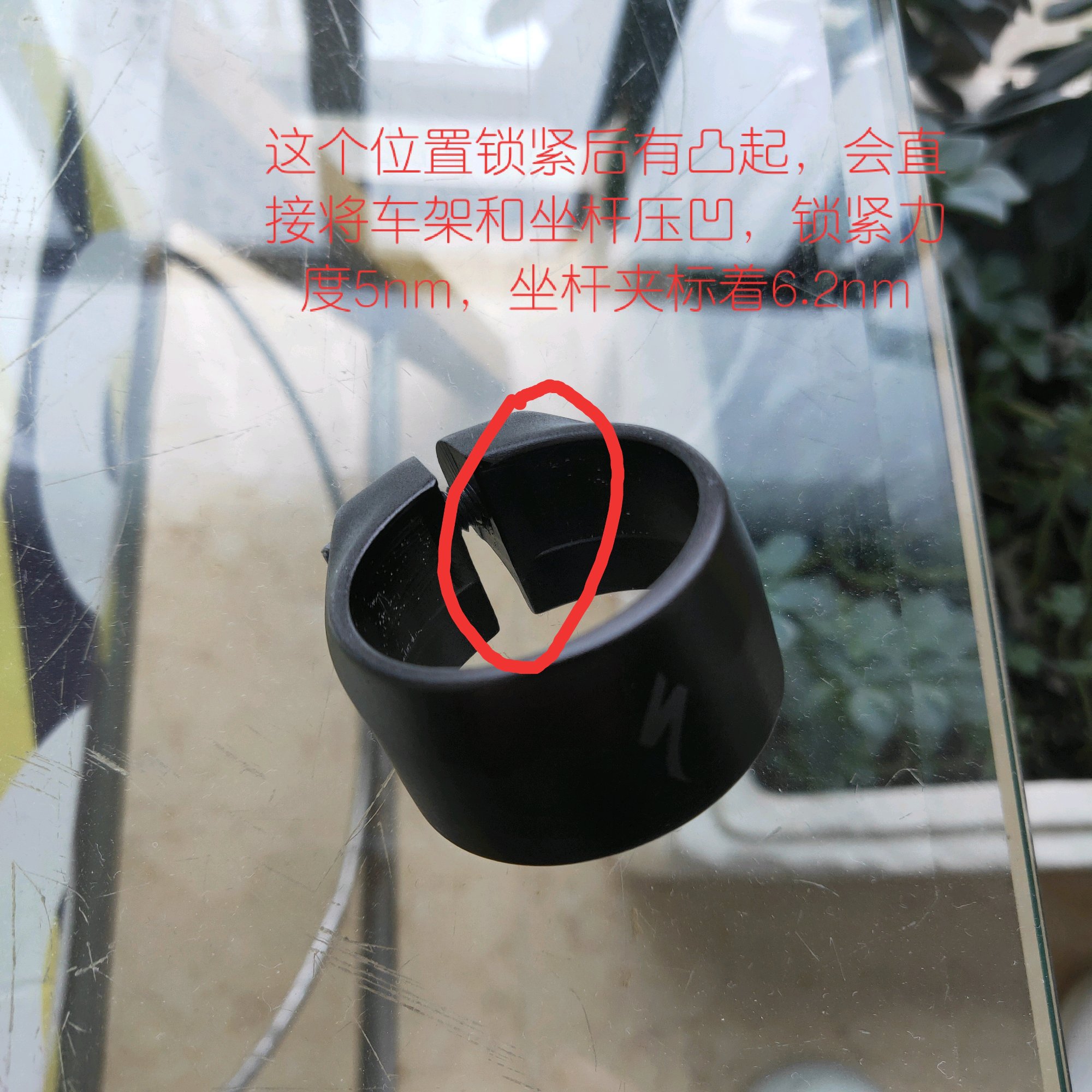 我都是把坐管夹横过来用的,缺口对齐车架的缺口,这样就不会挤坏了,原来车架的坐管孔已经被挤的碳布分离,不过不影响了