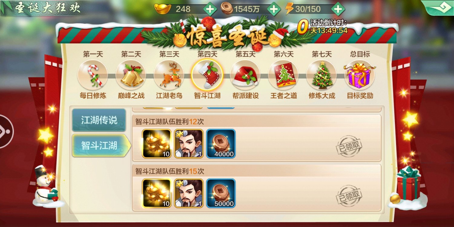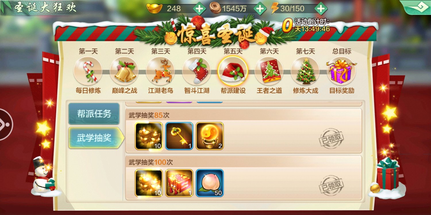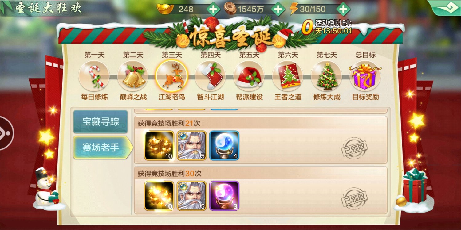 作为一个玩了五个多月的老菜鸟,其实已经相当佛了,没有特殊情况基本就是日冲拿个奖励的节奏!不过这次圣诞活动得105成就居然拿到了,我只能说不放过任何一个机会总是对的,由于每天不苟元宝,也不充值导致元宝一直在一万6.7徘徊。先看看第一天的任务,没啥好说的,七天活跃,基本每个人都可以完成了!再看江湖挑战,因为第一天所以没扫荡多少只是把体力全用了,除了段誉觉醒个主角御魂!没啥特别的,接下来贴吧不吞贴的话,就一起来看看我是如何完成这105成就的!