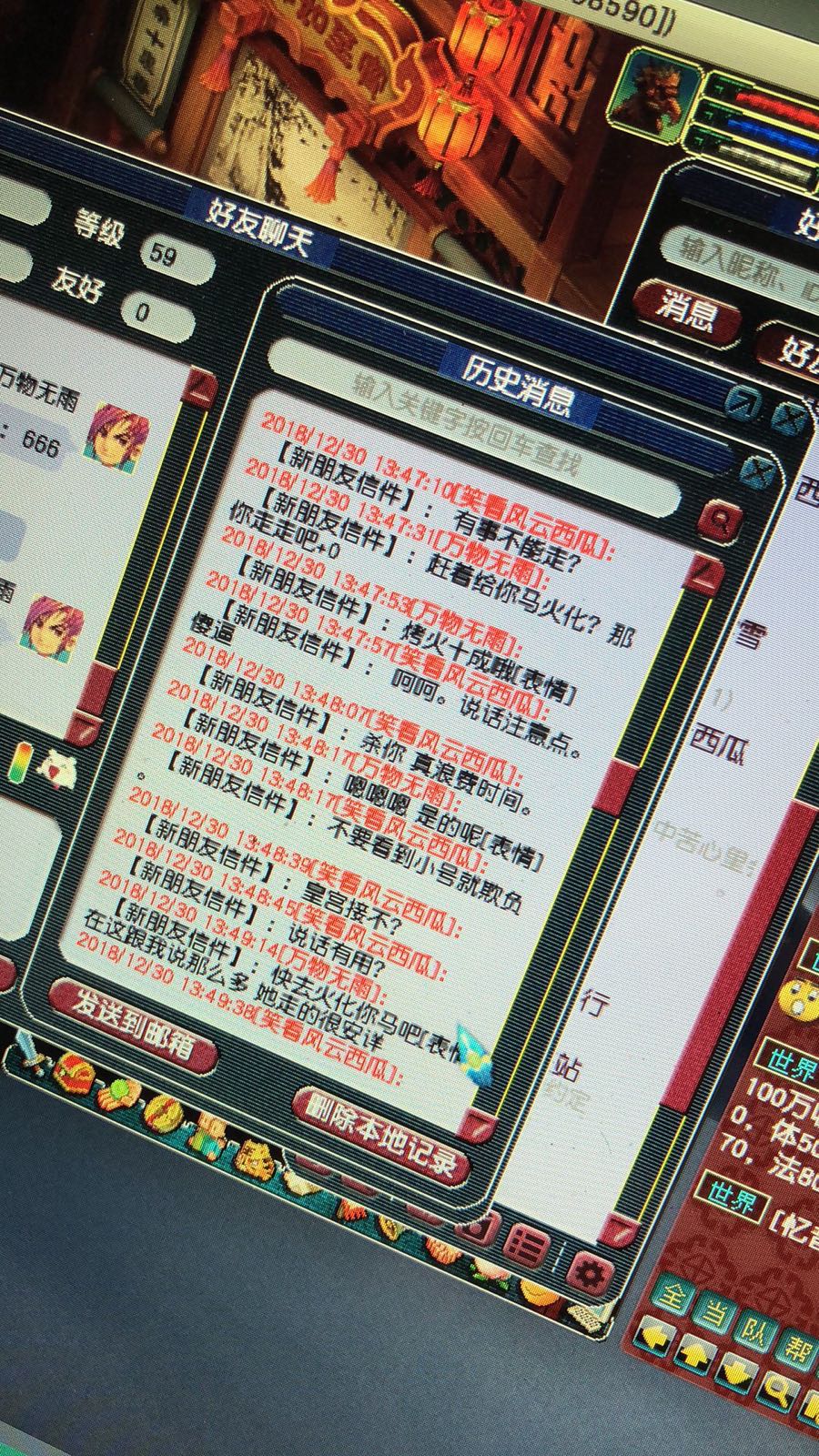 日常抓鬼20只 四眼五万的事情 死了一个不来了 有个话都不说跳车了 我去随便加两个人抓完没毛病8 加回来这人从头到尾没出手过 就出个bb 然后直接又跳车了 加上刚刚那两个麻瓜我是真火了 直接去拿了勾魂索在龙宫蹲了10分钟 然后这b叫我去野外 一看五个人蹲在那呢 幸好我跑得快