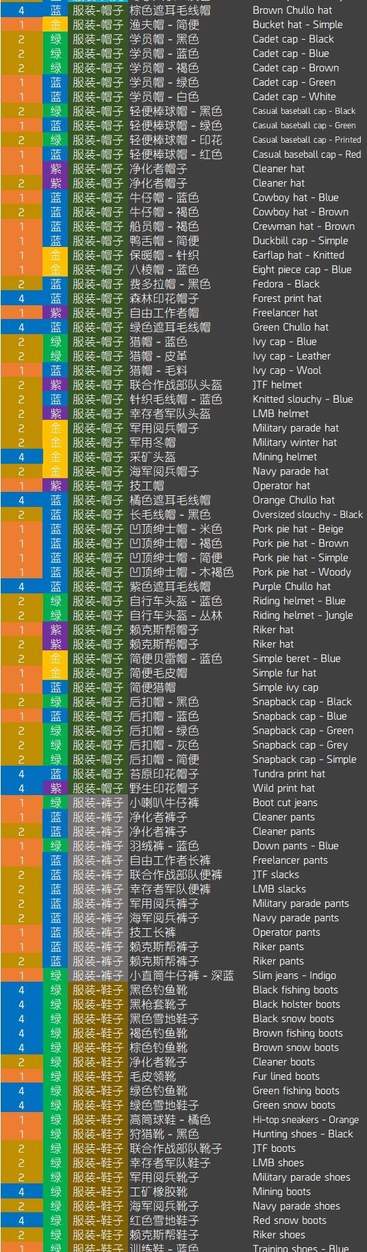 物品清单(排序依据:1类型 2英文名):