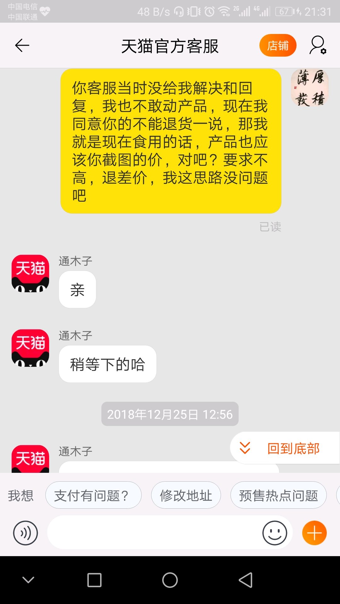 12月14号楼主在淘宝上看看有没脱脂牛奶,经过查找还是觉得伊利家的拜拜君脱脂奶靠谱,毕竟国企嘛,于是就在伊利旗舰店下单,我是太原的第二天就到货了,我看了下是从榆次发来的,怪不得快啊,我收到货后两箱子奶新新的就没细看放到家里就忙事去了,回来后正要打开包装,一看日期是9.18生产的就不高兴了,打开天猫一看才发现这个拜拜君是一个系列一个系列底下又分两种产品:根据伊利旗舰店所展示的图片蓝箱子粉小包的是脱脂奶85R,粉箱子蓝小包的是普通奶65R(活动价是五十多块),而我本来是要脱脂的,结果下单买成了普通的,我向客服提出要退货重买,结果发现伊利根本没有人工客服全是自动回复,向天猫反应后,天猫说伊利售后由天猫接管,我觉得不管谁服务都一样,就把事情给天猫客服说了一边,然后就有了各种扯皮,截图在下面。