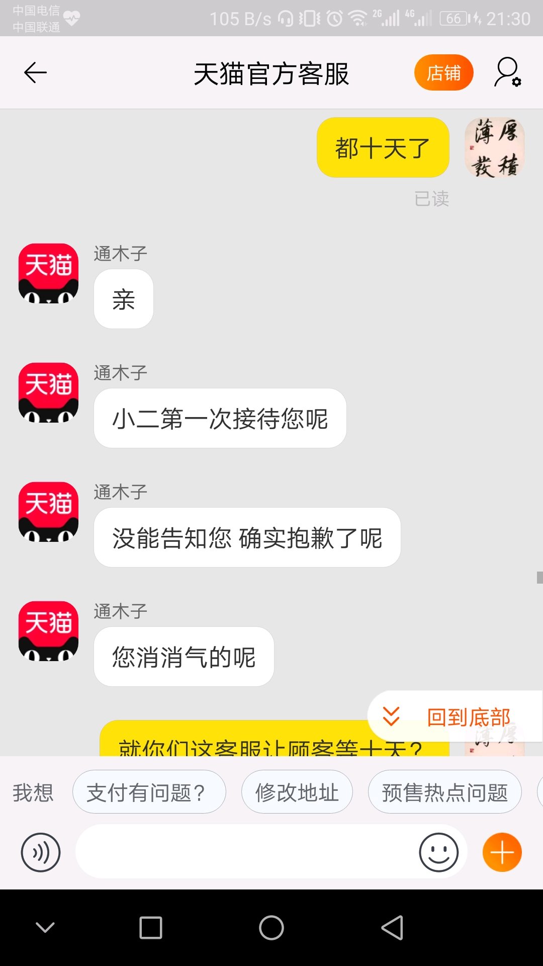 天猫客服刚开始说他们权力有限给反应到上级专员,让专员联系我,现在我才知道压根就没有什么专员,全是客服自己编的,还说已经联系过我,我这二十天来压根就没接到来自杭州的电话