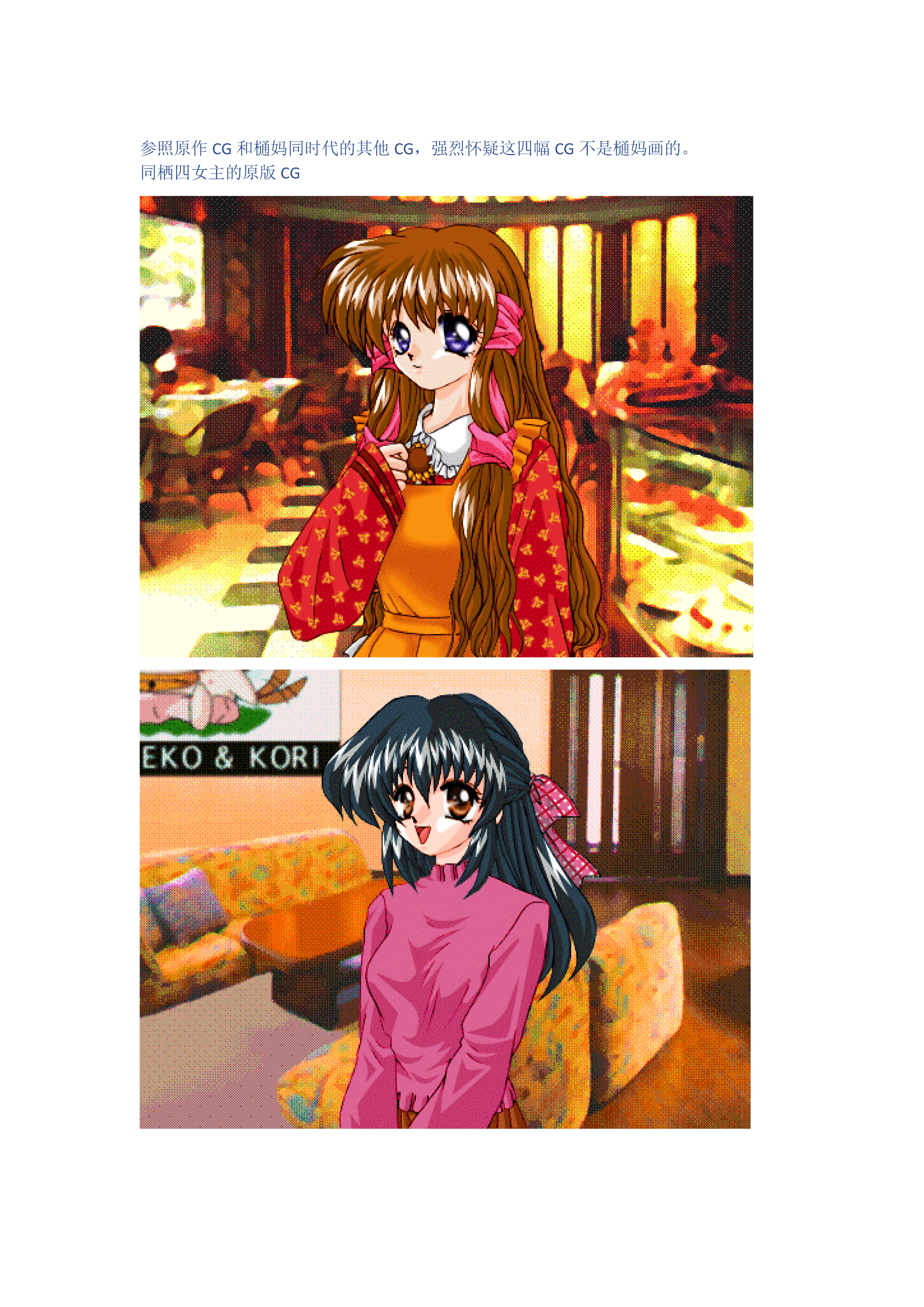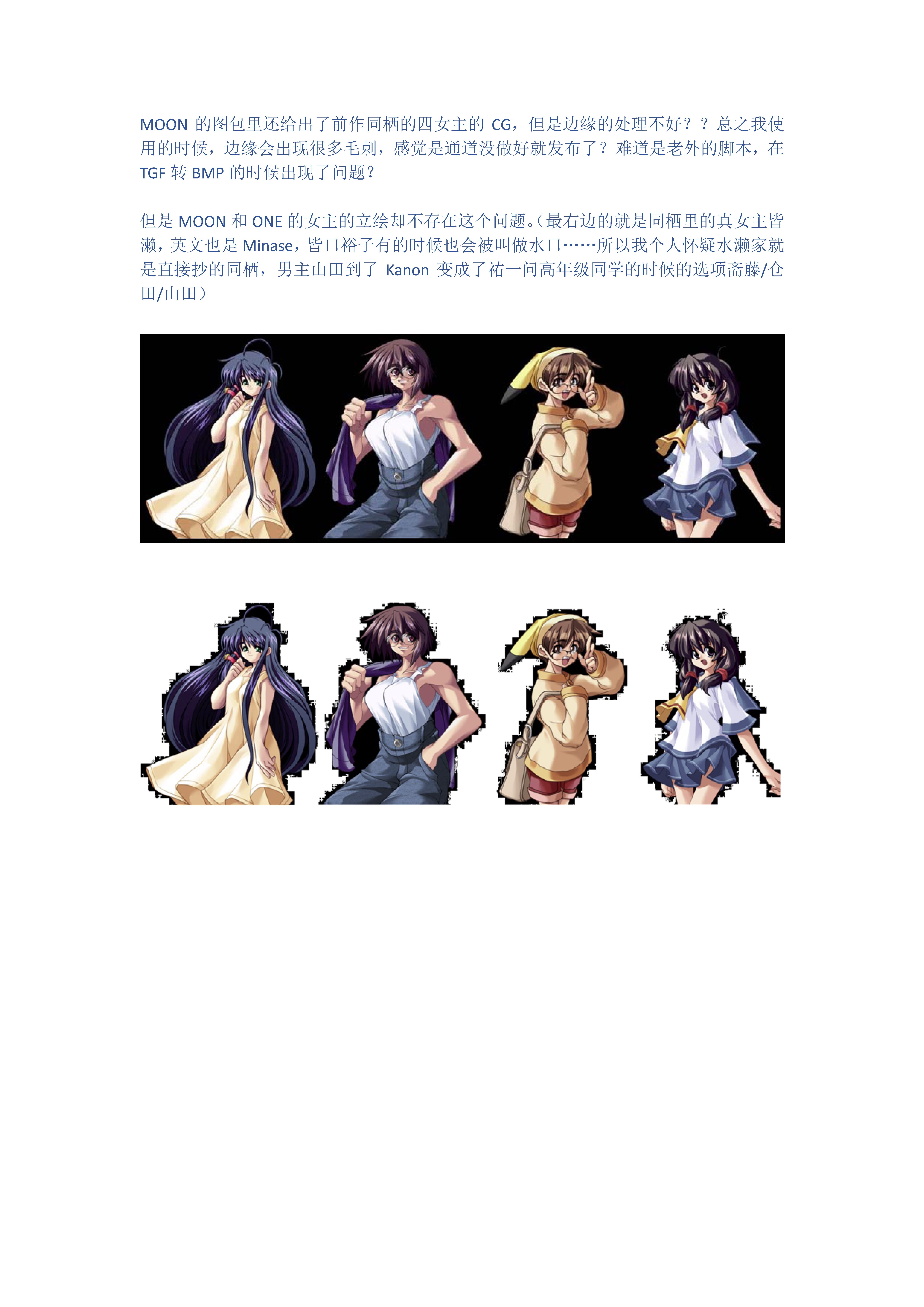 首先是MOON。的四女主(巳间晴香、天沢郁未、名仓由依、鹿沼叶子)+名仓友里+ONE的长森瑞佳,均未裁剪,CG都画到大腿处,这两代的CG画的很像,似乎ONE的CG的立体感稍显不足,应该是室内光源(点光源)和室外光源(平行光)的不同