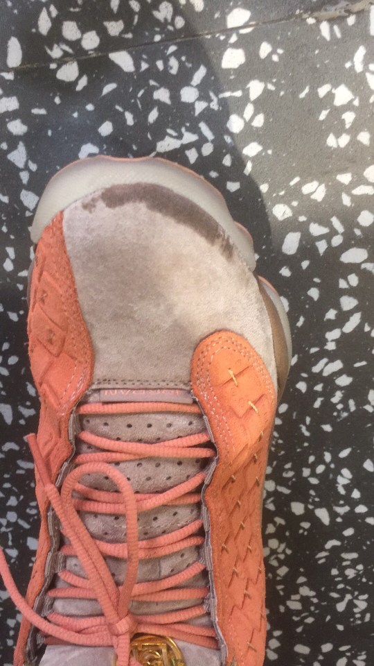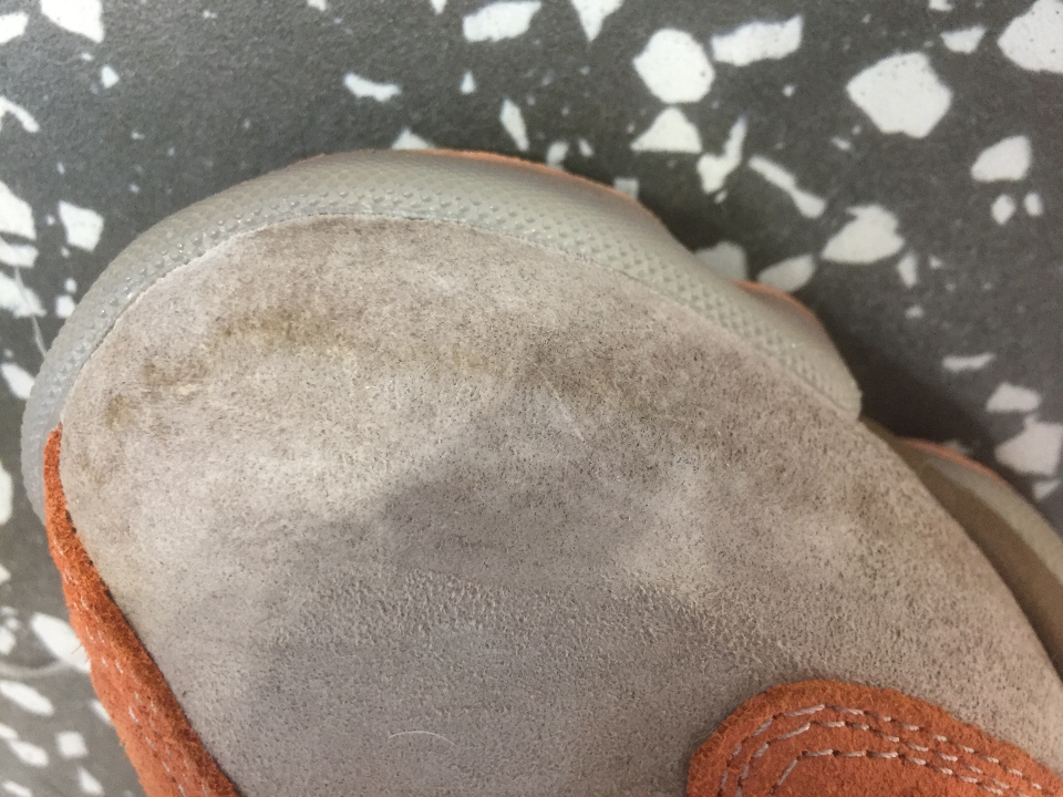各位看官,上个月25号左右订下了兵马俑,非常激动非常期待,等了10天鞋子才到,打开什么毛病瑕疵都没有,上脚也很好看。但穿了一天,问题就来了,鞋子刚到的晚上我就穿着去了健身房,跑了步,出了汗,当时没什么,第二天早上穿着经过了半天,鞋子前面灰色翻毛部分居然因为脚部的出汗打湿了,而且从里面溢出来了,然后鞋子就成这样了