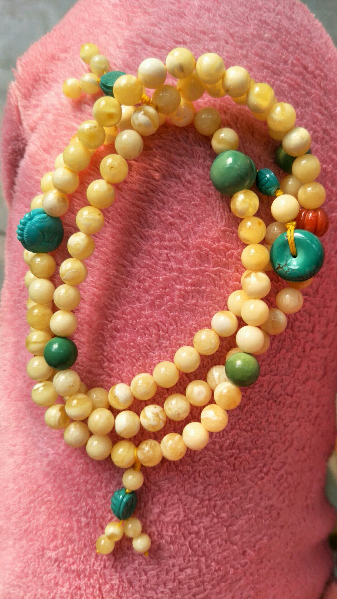 蜜蜡盘得变黄了是好看一些不过绿松石变得那么深了不是很喜欢,不知道后面还会不会再变颜色的
