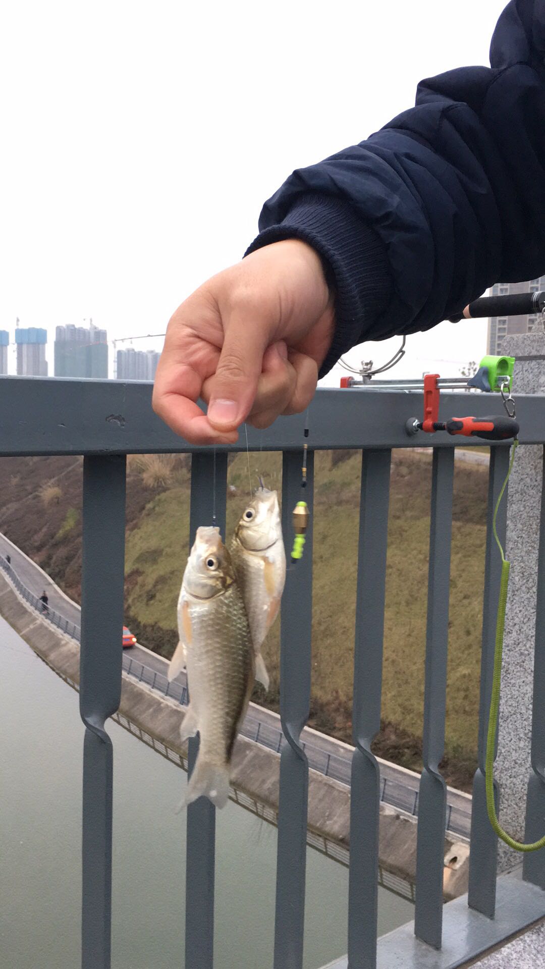 鲫鱼32个,1到3两,一线鱼3个。中午12点到6点。一根竿40元,光威小黄轮,主线0.06pe,子线0.8尼龙,伊豆3号,坠5.6克。桥高20米,水深7到8米。3级风。