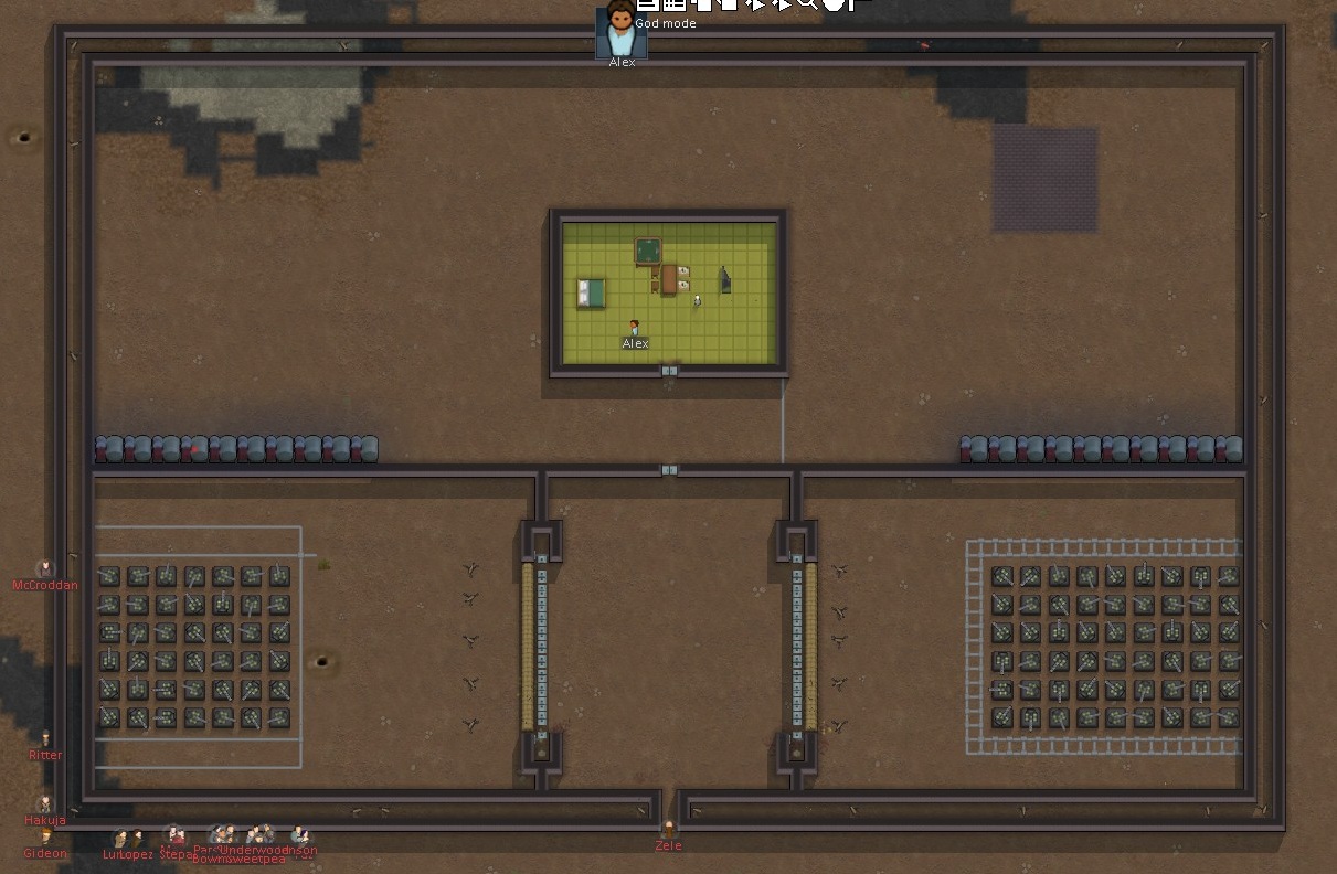之后做了一系列修改,包括增大安全区、在围墙内或外放机枪塔等等,当把下图区域之外的地方都放在机枪塔的范围内并把安全区扩大到5格宽时(当然基地内部并未被机枪塔覆盖),有一路海盗直接冲了进来,他们并没有往炮阵里冲,而是顺着安全区的路径冲进了基地,另外一路仍然傻乎乎跑去拆外墙,尽管被拆的墙壁在机枪塔的范围内(按着机枪围城思路,机枪连了电线)。