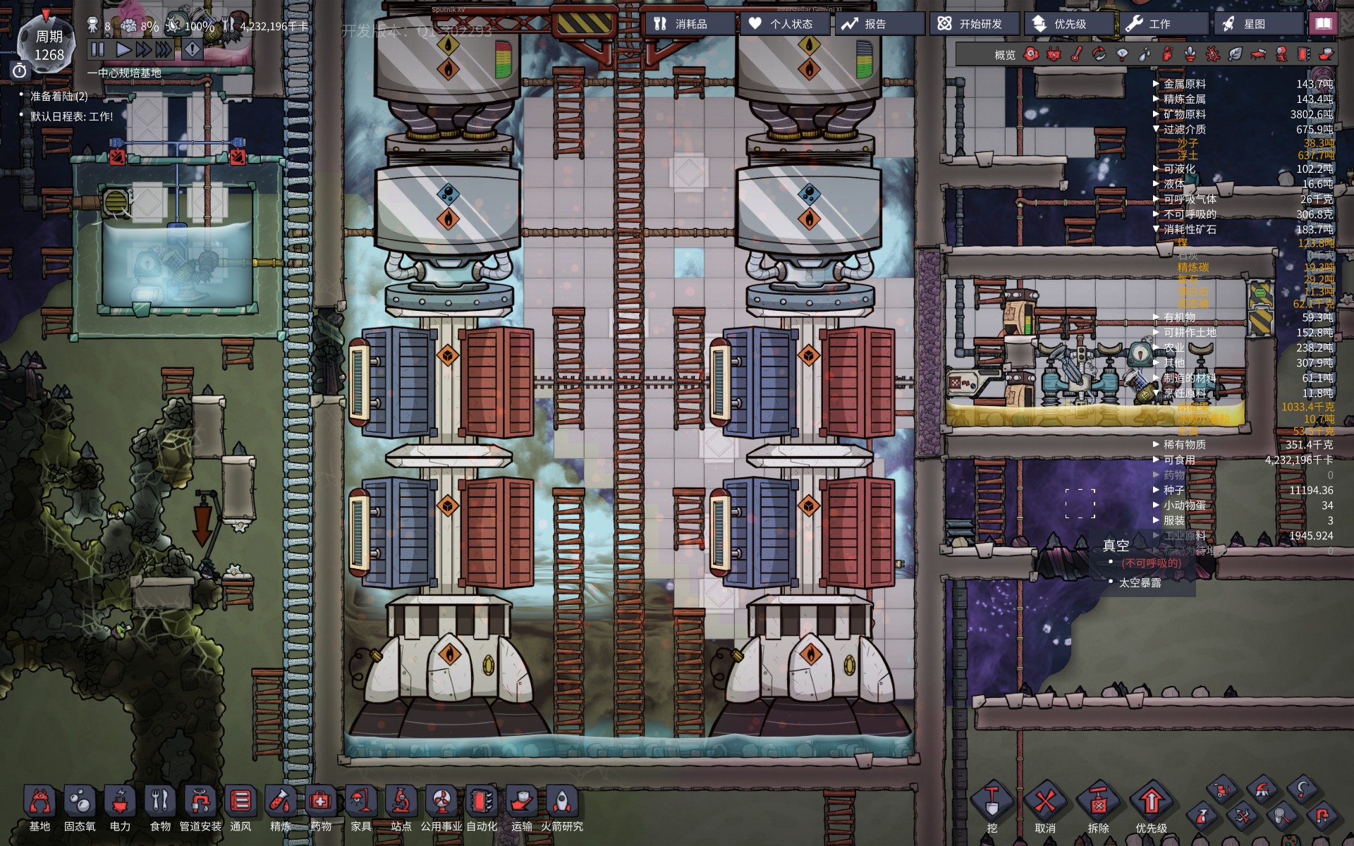 降落一周期后的状态。上方是完全开放的,背景墙也没有造齐,到处都空缺暴露。因为我造这个东西并不是为了回收尾气。。