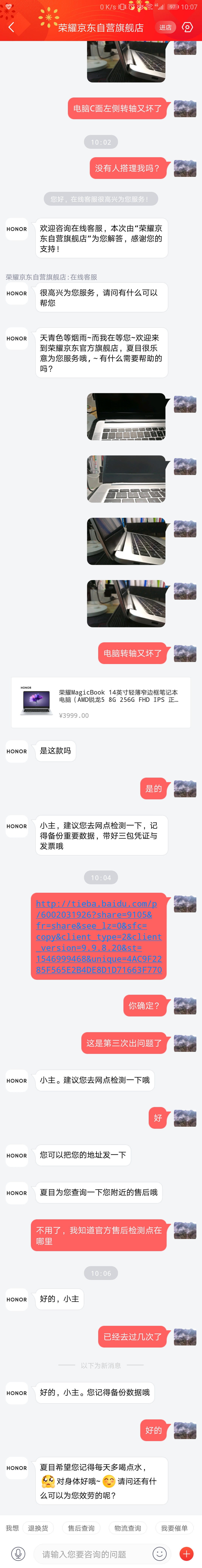 准备和Magicbook撕B,在京东买的首发电脑,六月份的首发。7月3号左右屏幕排线坏了,导致整个屏幕很暗,几乎看不见东西。找售后,两天拿到电脑后。7月9号C面键盘左上角凸起,简直B了gou了,我当时又再晚上找售后,又跑实体店售后,这直接就是质量有问题嘛,准备退货,但是不给我退,说是因为我激活了WIN10了,TM的质量问题,才一个月两个毛病就出来了,迫不得已我打了消协的电话,消协从中调节,说是再有问题就可以退掉。今天晚上,不对,应该是2019年1月8号晚上回到家打开电脑,发现咦,转轴上鼓了个包(请看图片),前面因为忘记备份图片结果前两次的图片删掉了。我准备明天起来看看荣耀售后给我怎么处理![[呵呵]](/static/emoticons/u5475u5475.png)