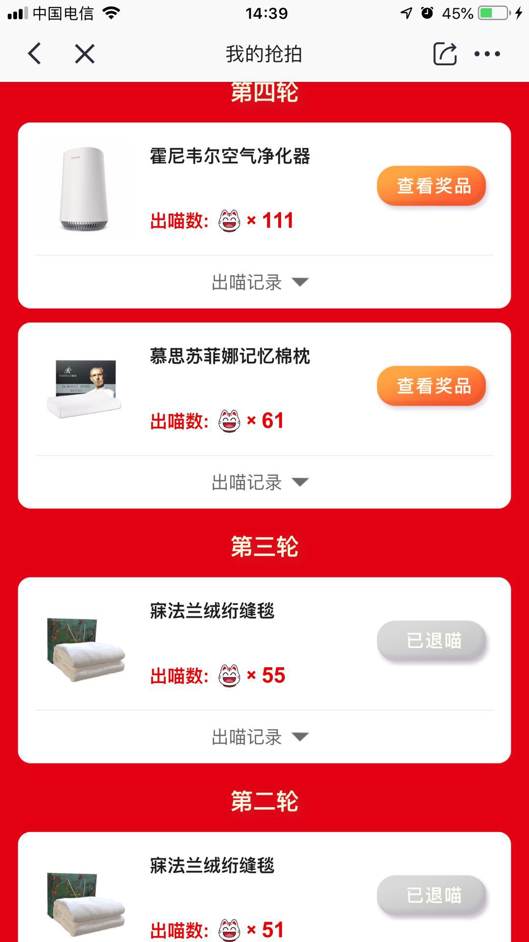 第一次参加招行的10元风暴,没什么经验。喵没有完全拿到,有时候漏掉了消费,最后账单分期的任务也没有做。第二轮和第三轮抢毛毯一直没有中,第四轮拿到了净化器和枕头,出的价格高了一点点,不过还算基本满意。剩下的十多只喵全部换了积分。