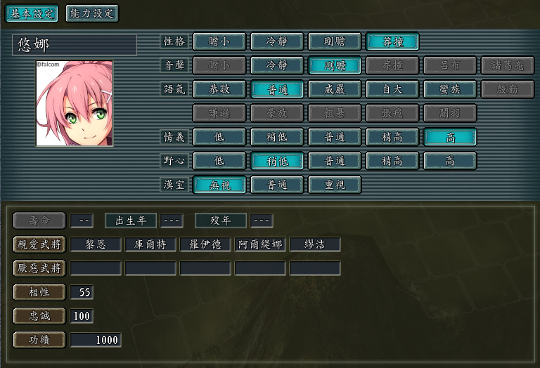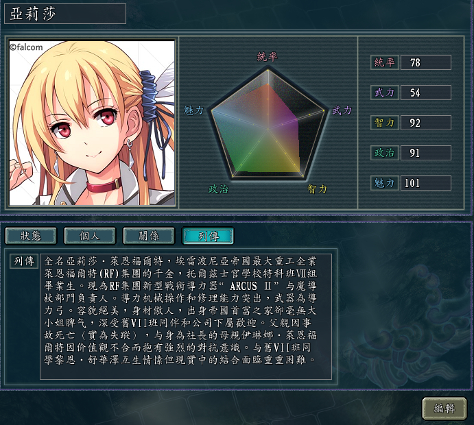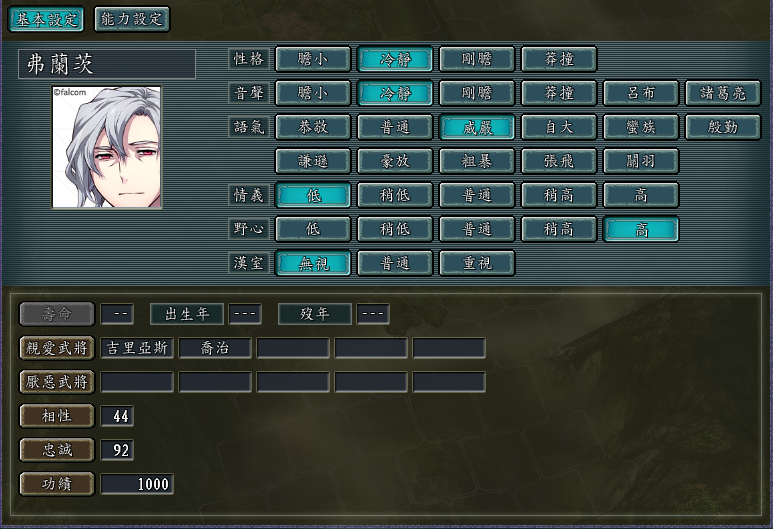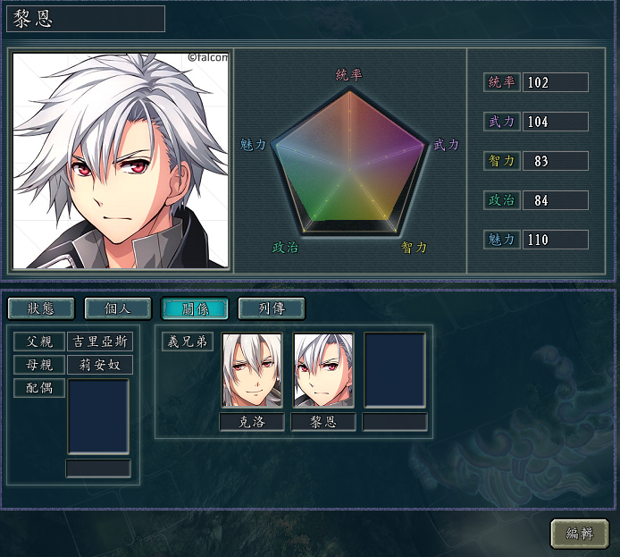 闪3中文通关后一直无所事事,上周突然灵光乍现弄出了这么个东西。选用三国志11血色衣冠MOD5.0版本,使用SIRE v1.28d、san11editor1.06修改器和三国志11头像编辑器1.09版。人物以闪之轨迹4登场角色为基础,按照楼主个人喜好有所添加,共创作新武将68人,头像多数采用官网人物介绍头像,暴击图修改为该角色游戏中S技立绘,无S技者使用闪4官方宣传海报图,为每名角色撰写了列传(相当费时[黑线])并谨慎设计了人物关系(配偶除已判明之外均未设定,可自行结合),欢迎插楼多提宝贵意见,楼下放图