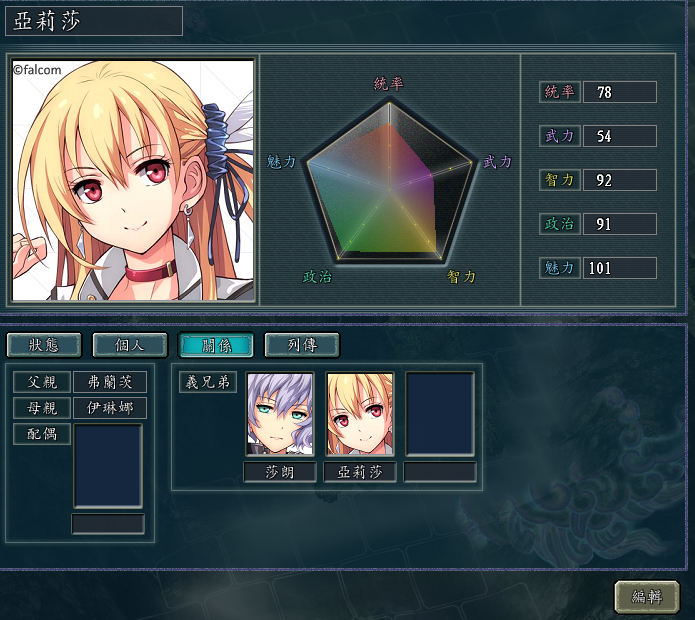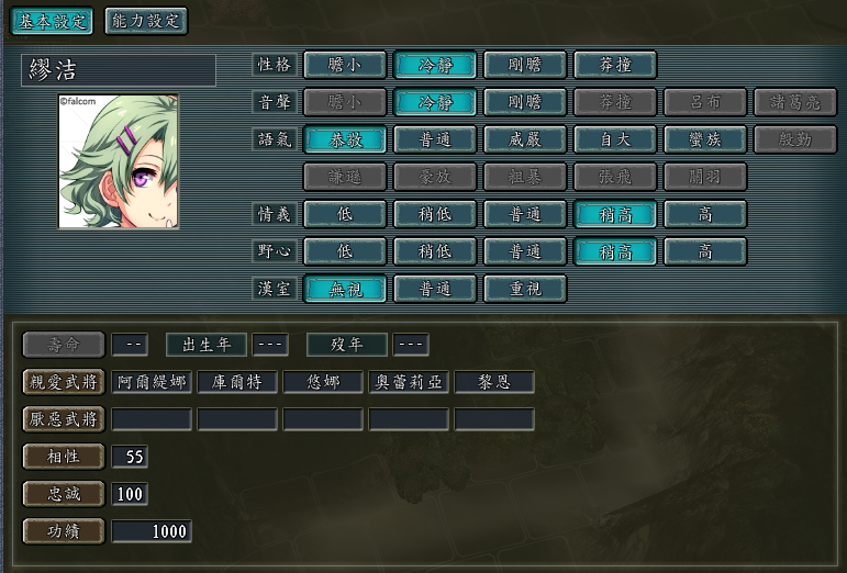 亚莉莎设定为智力型副将,特技“奇谋”实为原版特技“倾国”(对无女性武将的部队计略成功率2倍)的血色升级版,魅力方面力压缪洁1点。[滑稽]义“兄弟”为雪伦。列传中带有楼主本人的私心。[滑稽]