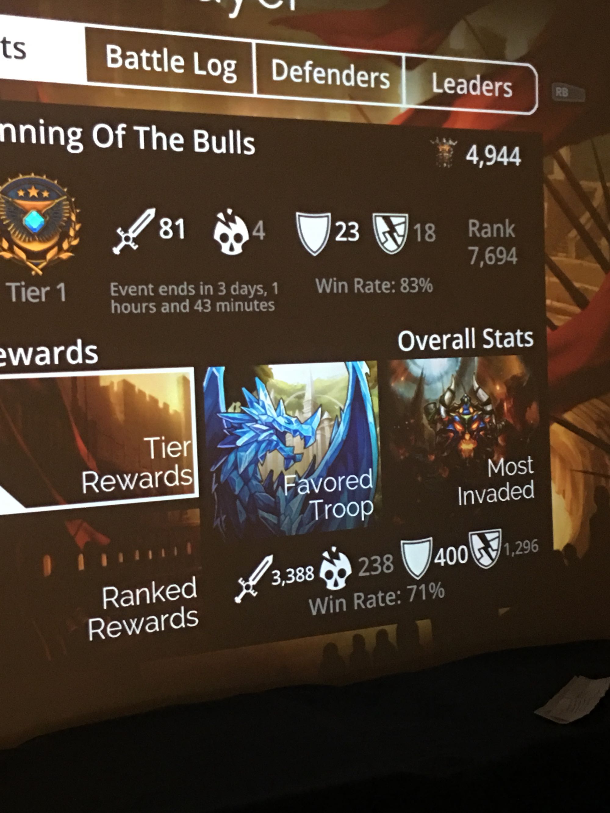 23胜18负换了这套矮人防守,来欺负我的人少了,胜率也上去了,以前都是1胜4负左右。话说那个龙族的可以变龙宝宝的武器真给力呀。