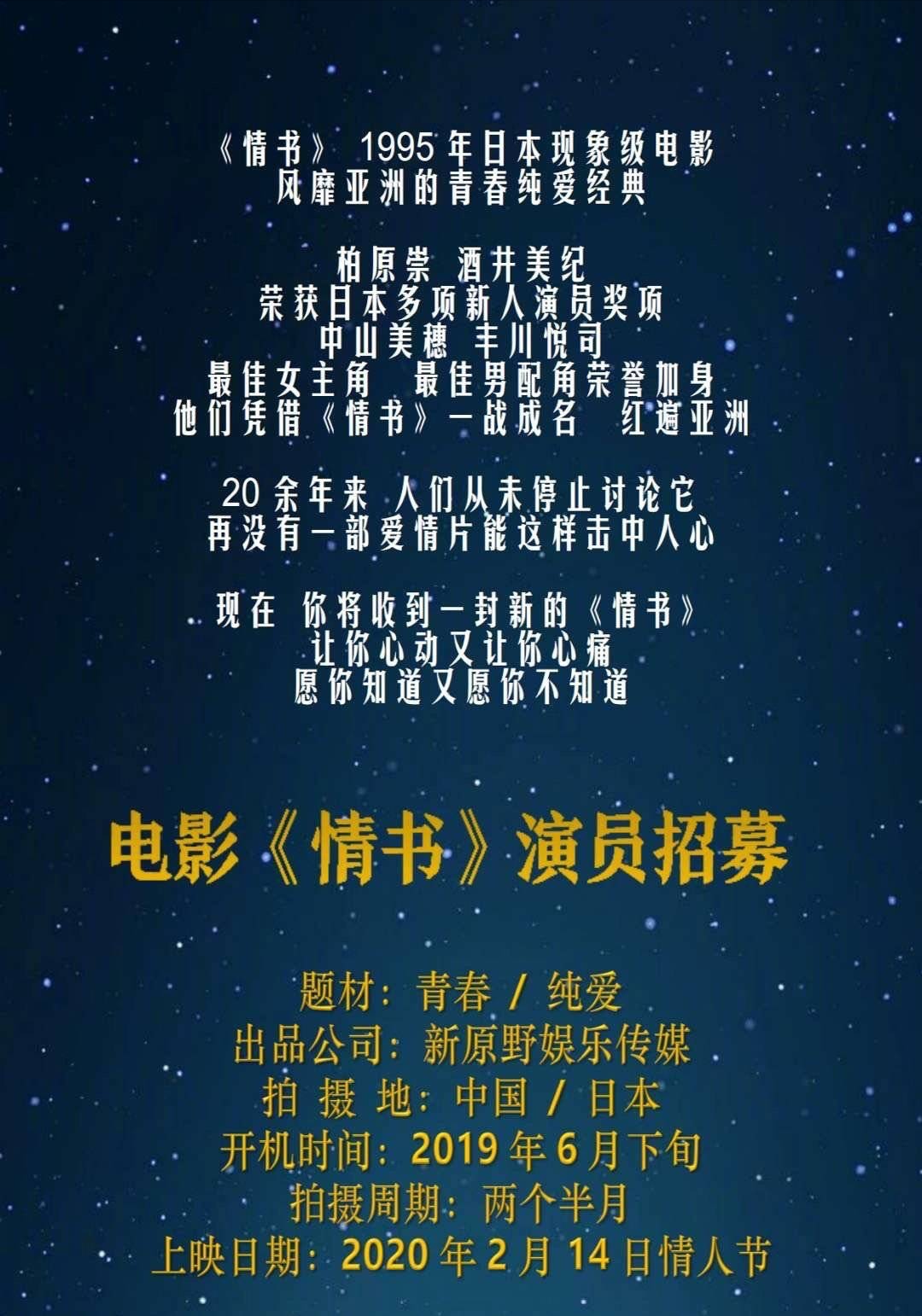日本导演岩井俊二执导的经典电影《情书》将翻拍中国版,由青年导演刘雨霖(刘震云女儿,此前曾执导电影《一句顶一万句》)执导,曾与李安合作过《卧虎藏龙》《色戒》等多部影片的王蕙玲担任编剧,目前正在招募演员。电影开机时间定于2019年6月下旬,拍摄周期两个半月,上映日期为2020年2月14日情人节。