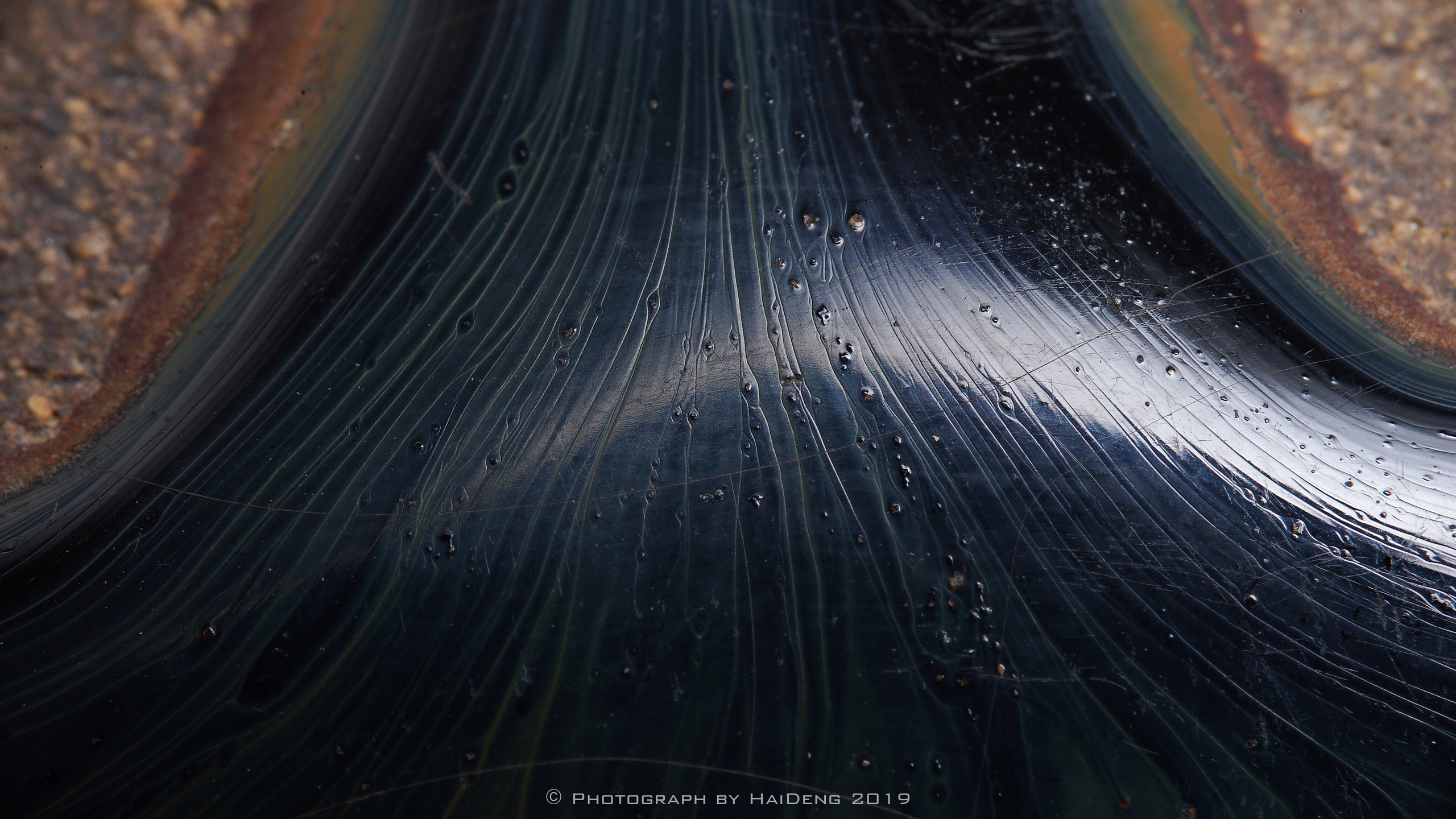 土里埋的久了,土沁水渍等反应,在老盏里一般称七彩蛤蜊光