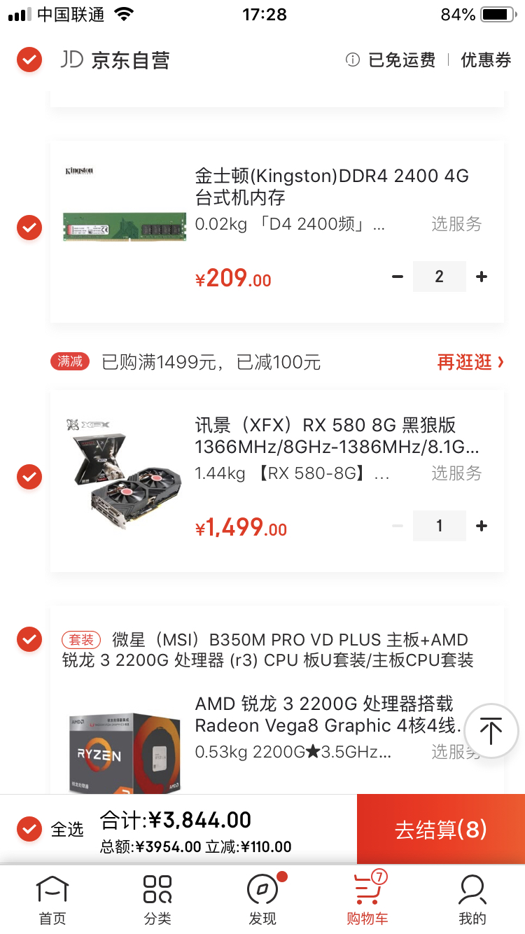 i3 8100散片 699 散热 : _ 赛普雷屠城 40 主板 : _ 华硕B360M K 549 内存 : _ 威刚 8G 2400 DDR4 339 固态 : _ 威刚SP580 240G 239 显卡 : _ 蓝宝8GRX580 2048SP海外 1199 电源 : _ 振华 铜皇450W 239 机箱 : _ Tt 启航者F1 黑 150 合计 : _ 3454