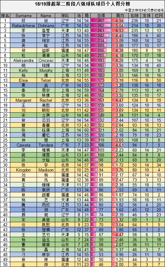 【数据】排超第二阶段八强球队及个人扣球、拦网、一传数据