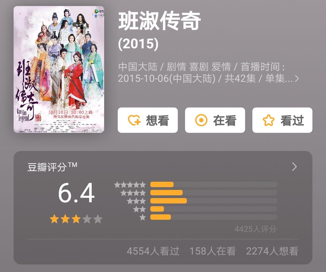 班淑主要是丫头那个时候作死得罪奶奶,要是一轮上星播的话评分要好些,这剧太冷门。不过大多数角色都是杜撰的,当架空看没压力。这剧确实是凭实力挣的6.4啊😂😂😂