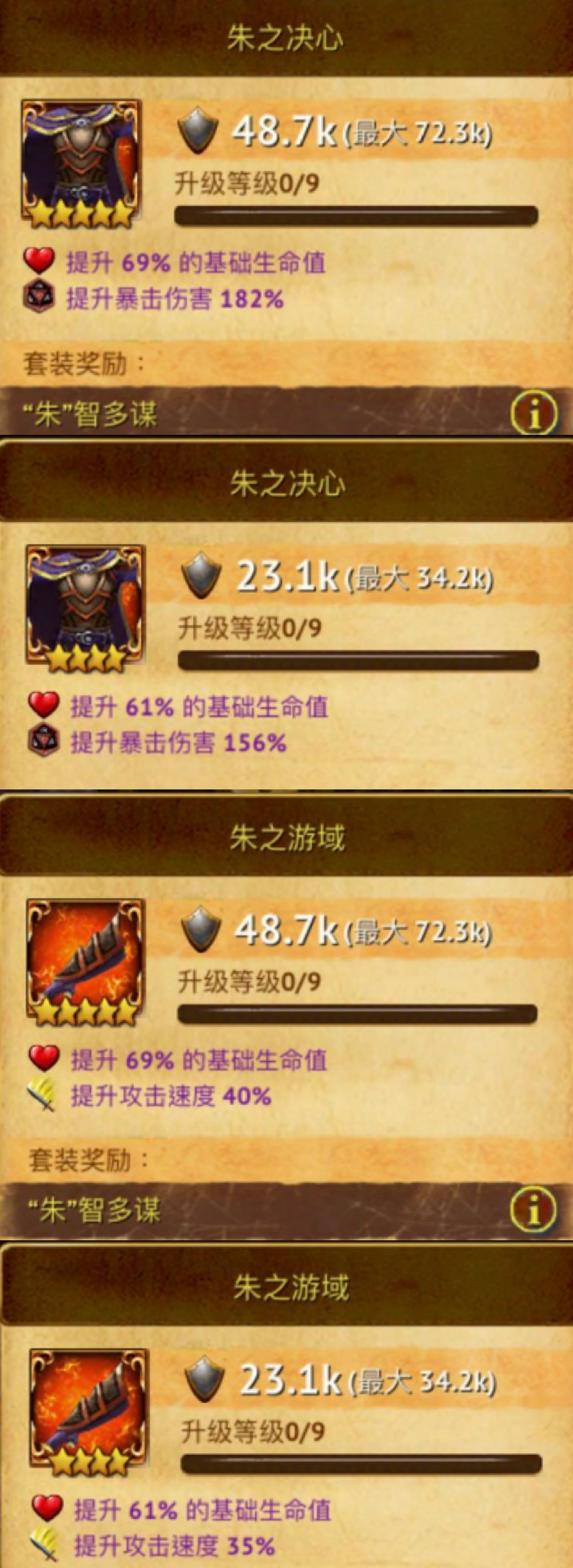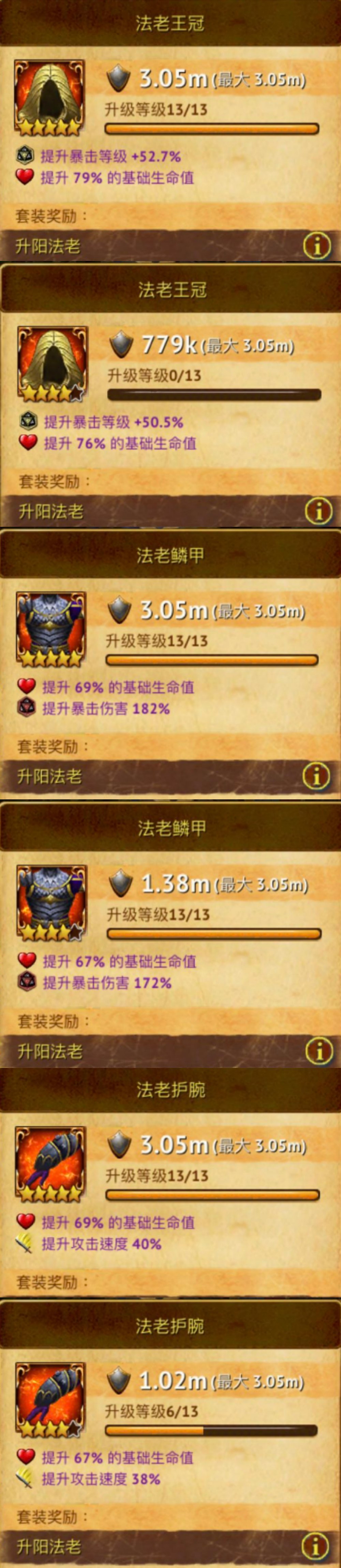 p6:五星和四星的对比,紫色属性的差距还是比较大的,对比p4看看,意味着压战力的话你也必须把除了裤子和鞋子以外的装备搞到五星,压不住的话可以考虑用2星不强化的裤子鞋子。